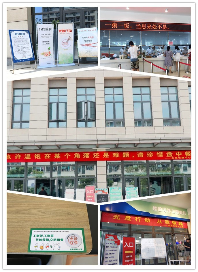 粥一饭,当思来之不易。学校加强对师生员工的节粮、节菜教育,加大“光盘行动”宣传力度,推行光盘换餐券、换积分等激励措施。食堂设置节约粮食、文明就餐的提醒标识,强化广大师生的节粮意识。通过“杜绝舌尖上的浪费”,引领师生养成节约用餐的良好习惯。后勤饮服中心借助展板、海报、文明桌贴、横幅、食堂LED显示屏、江科大微后勤等,多渠道、全方位弘扬勤俭节约,制作光盘行动签名墙。材料、电信学院团员青年在食堂餐具回收处摆放了抽奖小便签和各种口味薄荷糖,作为践行光盘行动的奖励。遇到浪费食物的同学就对其进行劝导,鼓励他们在购买饭菜时适当增减,争取做到“心知肚明”“量力而行”。材料学院严豪敏同学说:“这次光盘活动给同学们敲响了警钟,在这个不愁吃不愁喝的年代,我们更要居安思危,勤俭节约。我们一定要从自身做起,为节约奉献自己的力量。”船海、生技学院开展了“节粮爱粮”光盘打卡活动。船海学院将活动分为线上挑战赛和线下分享周:线上挑战赛,师生对自己的光盘进行QQ空间、朋友圈分享打卡,集赞兑换纪念;线下在学校食堂对每一餐实现光盘的师生给予水果、零食等鼓励。