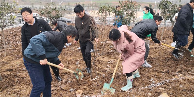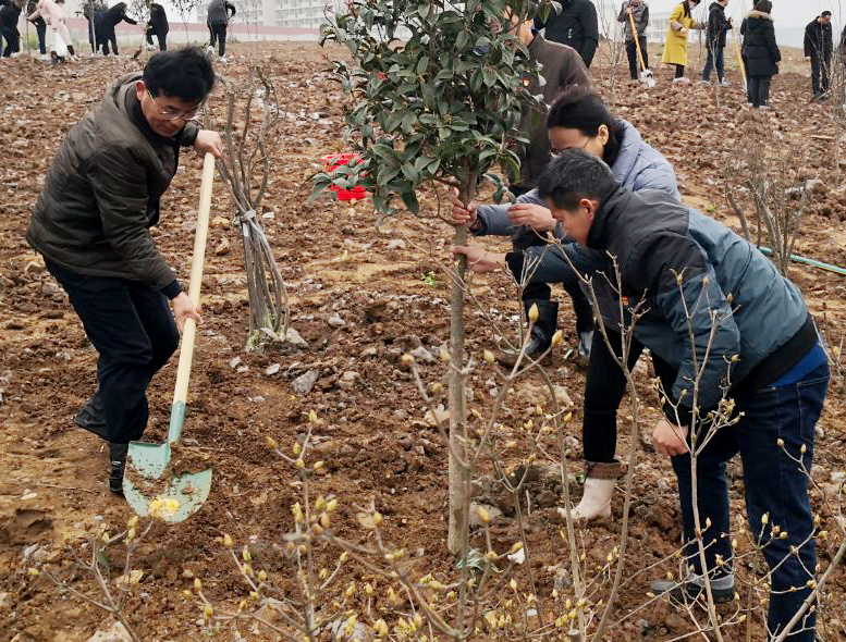 春日的十里长山校区万物吐新,充满生机。党员同志以支部为单位,划片栽种,通力合作、相互支援。大家有的扶正树苗,有的挥锹铲土,有的填平树坑,有的踩实新土……一番热火朝天的忙碌之后,种好的树苗整齐排列,昂然挺立。近一个小时的时间里,种下了红枫、梅花、金桂、映山红等近400株树苗。许俊华副书记一边培土,一边和同志们交流。他说,校园景观绿化要整体规划、分步实施,党员干部带头参加义务植树,有关部门也要加强后期管护,确保成活率。