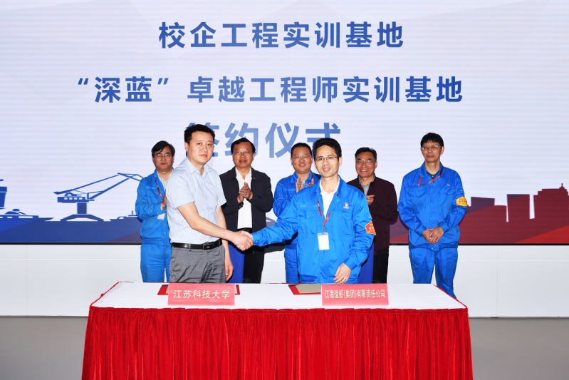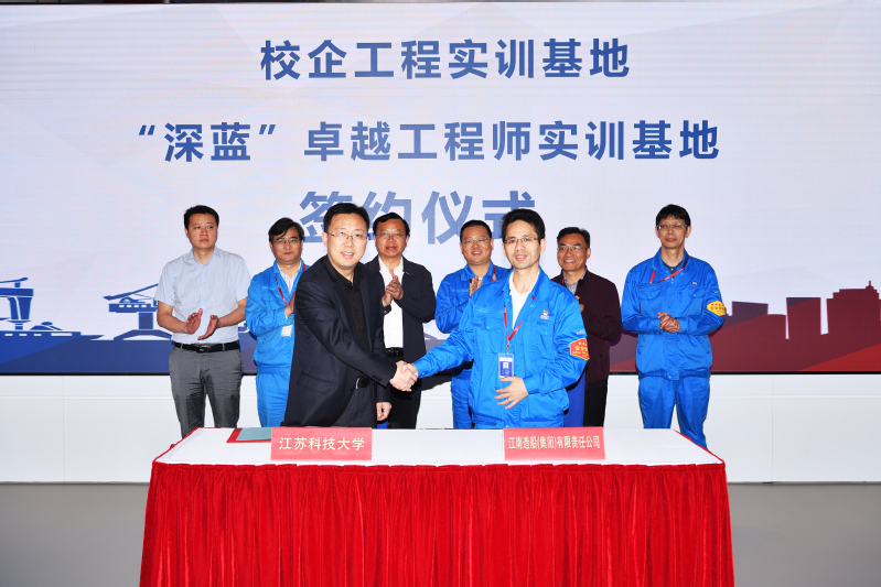 仪式上,江南造船公司人力资源部部长罗厚毅与球盟会qmh网站人事处副处长钱安其签署校企工程实训基地共建协议,与教务处处长田剑签署“深蓝”卓越工程师实训基地共建协议。