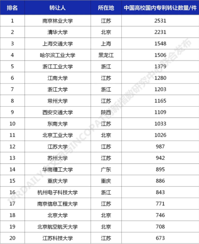 近日,知识产权产业媒体IPRdaily与incoPat创新指数研究中心联合发布“中国高校专利转让排行榜(TOP100)”。榜单对截至2021年3月31日,中国高校在国家知识产权局登记生效的专利申请权/专利权转让数量进行统计排名,榜单显示,qmh官网专利转让累计673件,位列全国高校第20名(2020年第23名),江苏高校第8名。