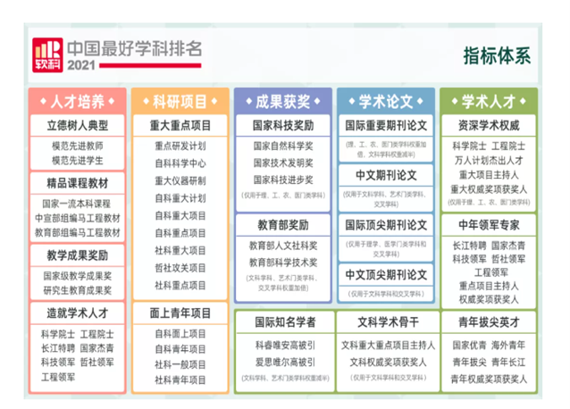 软科中国最好学科排名的指标体系包括人才培养、科研项目、成果获奖、学术论文、高端人才五个指标类别,下设17个指标维度,共计50余项反映学科竞争力的客观量化指标。排名数据全部来自权威第三方,如教育部、科技部、国家自然科学基金委员会、国际和国内文献数据库等。本次排名榜单包括96个一级学科,各个学科排名的对象是在该一级学科设有学术型研究生学位授权点的所有高校,发布的是在该学科排名前50%的高校。本次榜单共有486所高校的4992个学科点上榜。