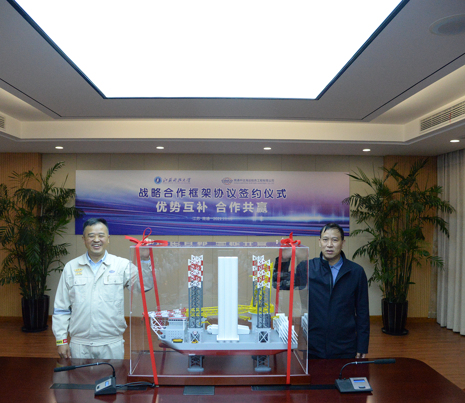校企双方还签订了战略合作框架协议、深水超大型自航自升式风电安装船核心技术联合攻关项目合同,并互赠纪念品。