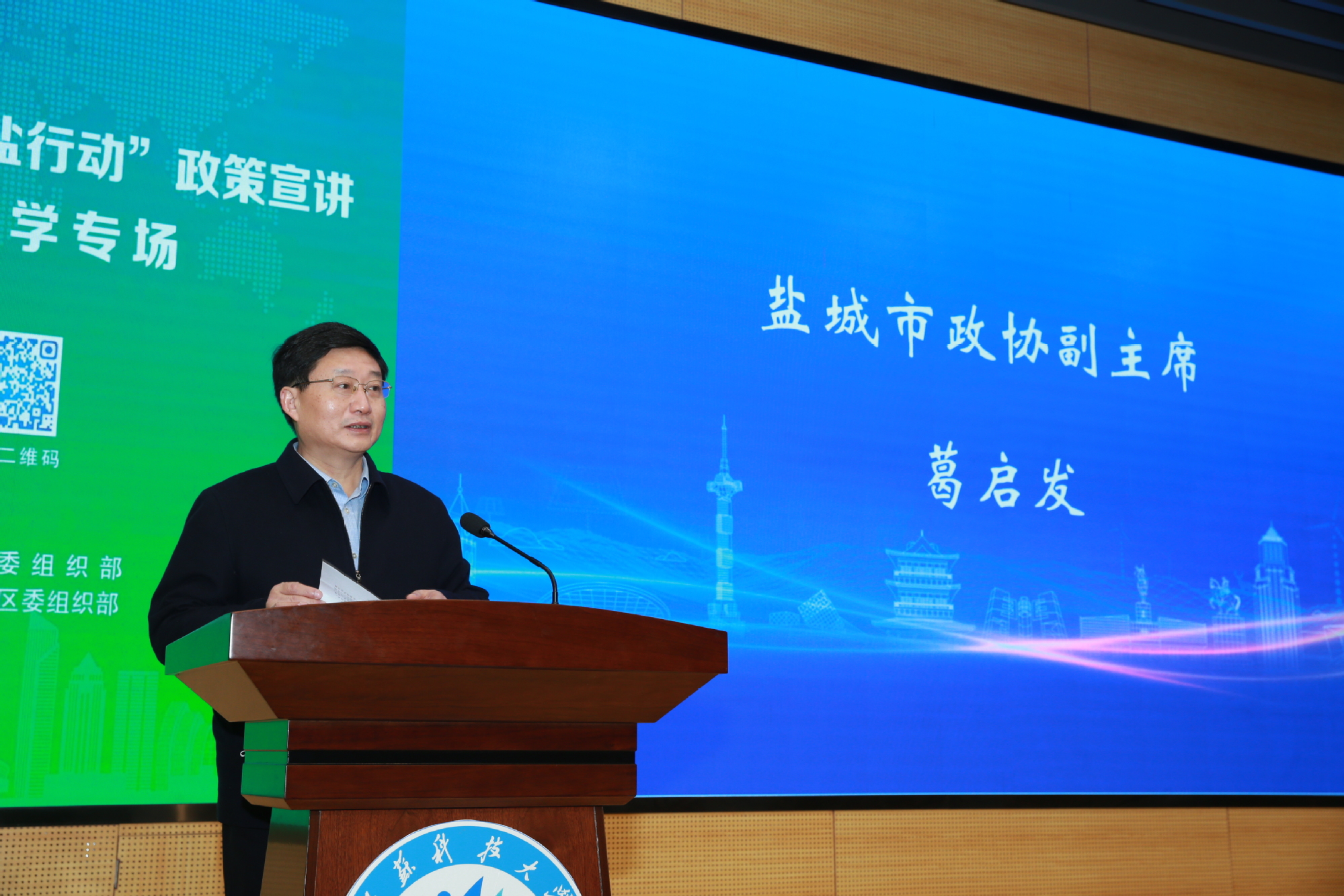 葛启发从“盐、镇区位相近、人文相亲、相互支持、共同前进”讲起,详细介绍了盐城的历史底蕴、自然生态、区位交通、产业发展等方面情况,展示了盐城人才强市的理念,表达了与镇江市携手并进、与江科大相互成就的愿景和期望。