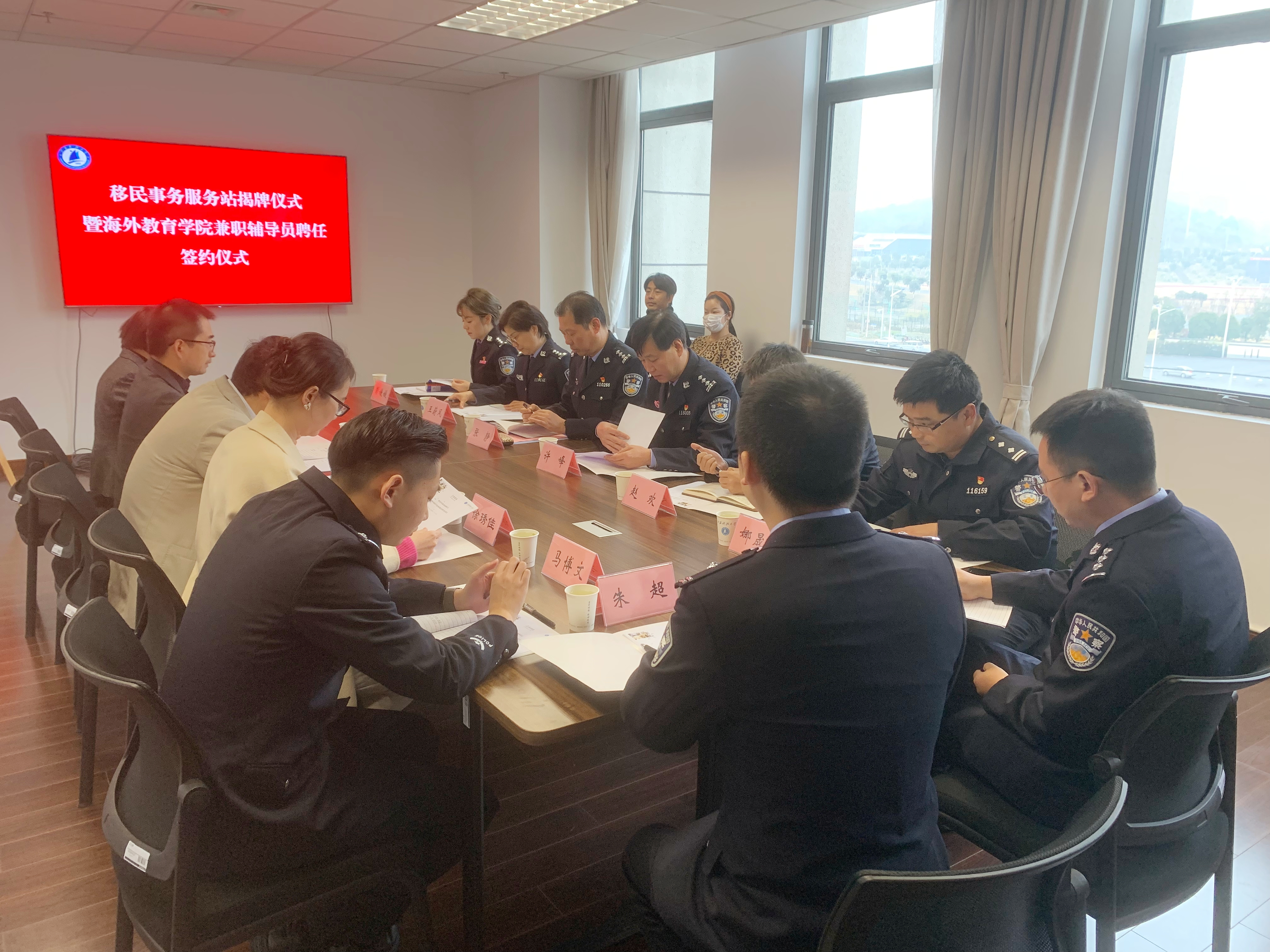 揭牌仪式结束后,镇江市出入境支队、丹徒分局和qmh官网海外教育学院签署了校外辅导员聘任协议。根据协议,镇江市出入境管理部门每年向海外教育学院派出民警做为qmh官网留学生校外辅导员。此次qmh官网共聘任了彭媛媛等6名民警为qmh官网留学生校外辅导员。仪式结束后,留学生管理人员与兼职辅导员进行了交流,共同探讨具体工作的开展与实施。