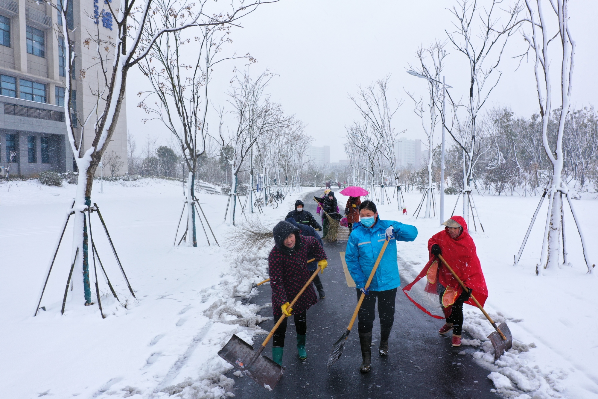 上午8:00,校园一片静谧,鹅毛大雪洋洋洒洒,后勤人行动起来,启动寒假极端天气应急预案。在后勤集团统筹下,物业中心、饮服中心会同华舟物业公司紧急调动组织了两校区120余名管理骨干、保洁人员,以校园主干道、食堂和宿舍之间、办公楼教学楼周边为重点,利用铲雪锹、扫帚等扫雪工具清理路面积雪、楼宇入口台阶,铺设草垫,并在校园主要道路上撒布了融雪盐。大家通力合作、不畏严寒,经过4个小时的奋战,校园内主要区域全部清理完毕,保证了留校师生员工的出行安全。