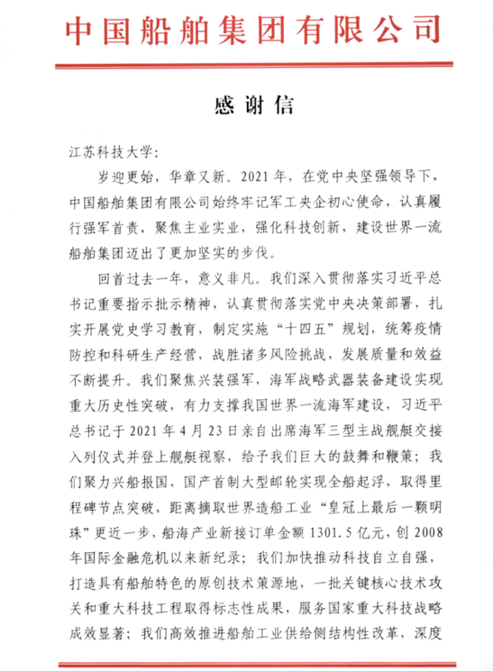 近日,qmh官网收到来自中国船舶集团有限公司的《感谢信》,衷心感谢学校长期以来的关心与支持。感谢信中提到,在充满希望的2022年,期望双方能够发挥各自优势,在船用低速机、智能制造领域进一步展开务实合作,以及高层次人才培养,携手向前、共同开拓,在全面建设社会主义现代化国家新征程上踔厉奋进、勇毅前行!为实现中华民族伟大复兴的中国梦不懈奋斗,以优异成绩迎接党的二十大胜利召开!