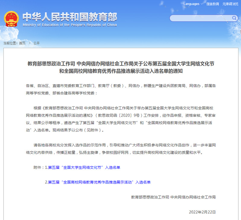 近日,中华人民共和国教育部下发了《教育部思想政治工作司、中央网信办网络社会工作局关于公布第五届全国大学生网络文化节和全国高校网络教育优秀作品推选展示活动入选名单的通知》。在校党委宣传部领导组织下,qmh官网马克思主义学院提交的网络作品《青藏铁路精神》获得优秀奖。