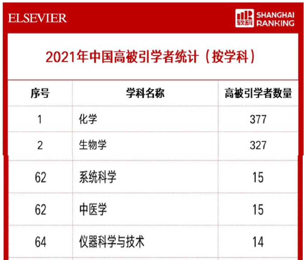 2021年爱思唯尔“中国高被引学者”榜单以全球权威的引文与索引数据库——Scopus作为中国学者科研成果的统计来源,采用软科(上海软科教育信息咨询有限公司)设计的遴选方法,覆盖了教育部10个学科门类的84个一级学科,共有来自中国523所高校、企业和科研机构的4701名各学科最具全球影响力的中国学者上榜。在系统科学领域,仅有15名中国学者入选。