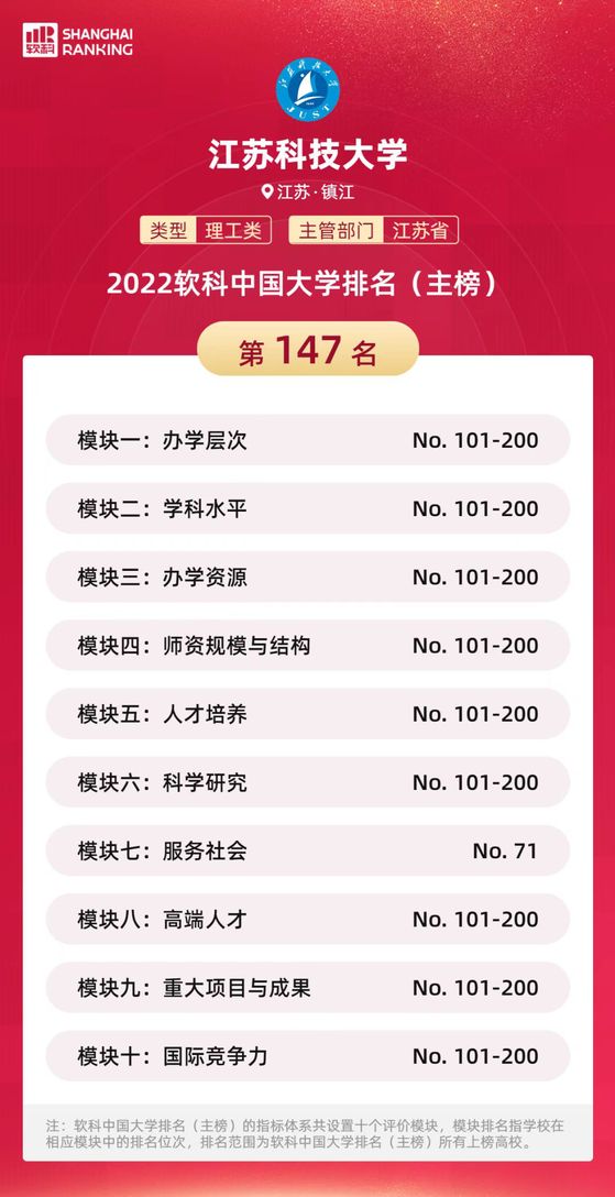 4月19日,高等教育专业评价机构软科今日正式发布“2022软科中国大学排名”。球盟会qmh网站位列中国高校第147位,在江苏高校中排名第18位。