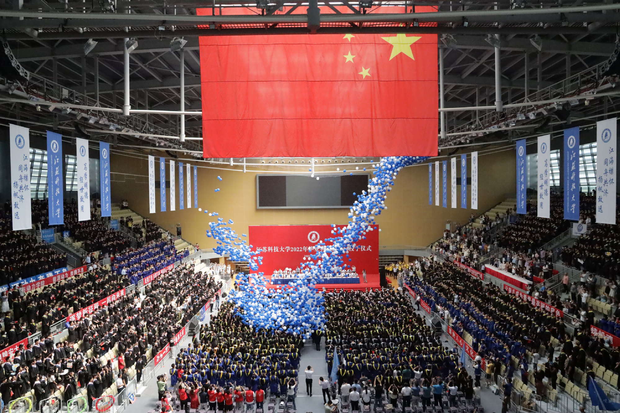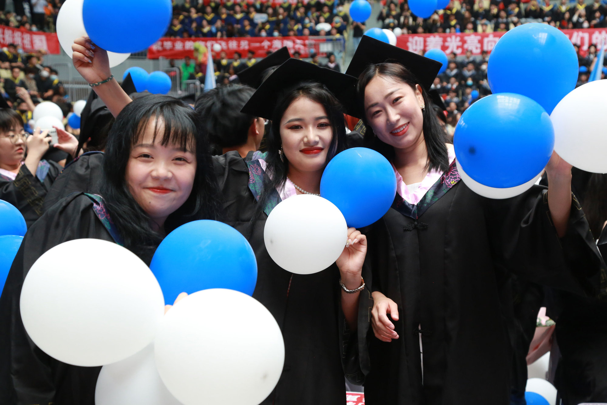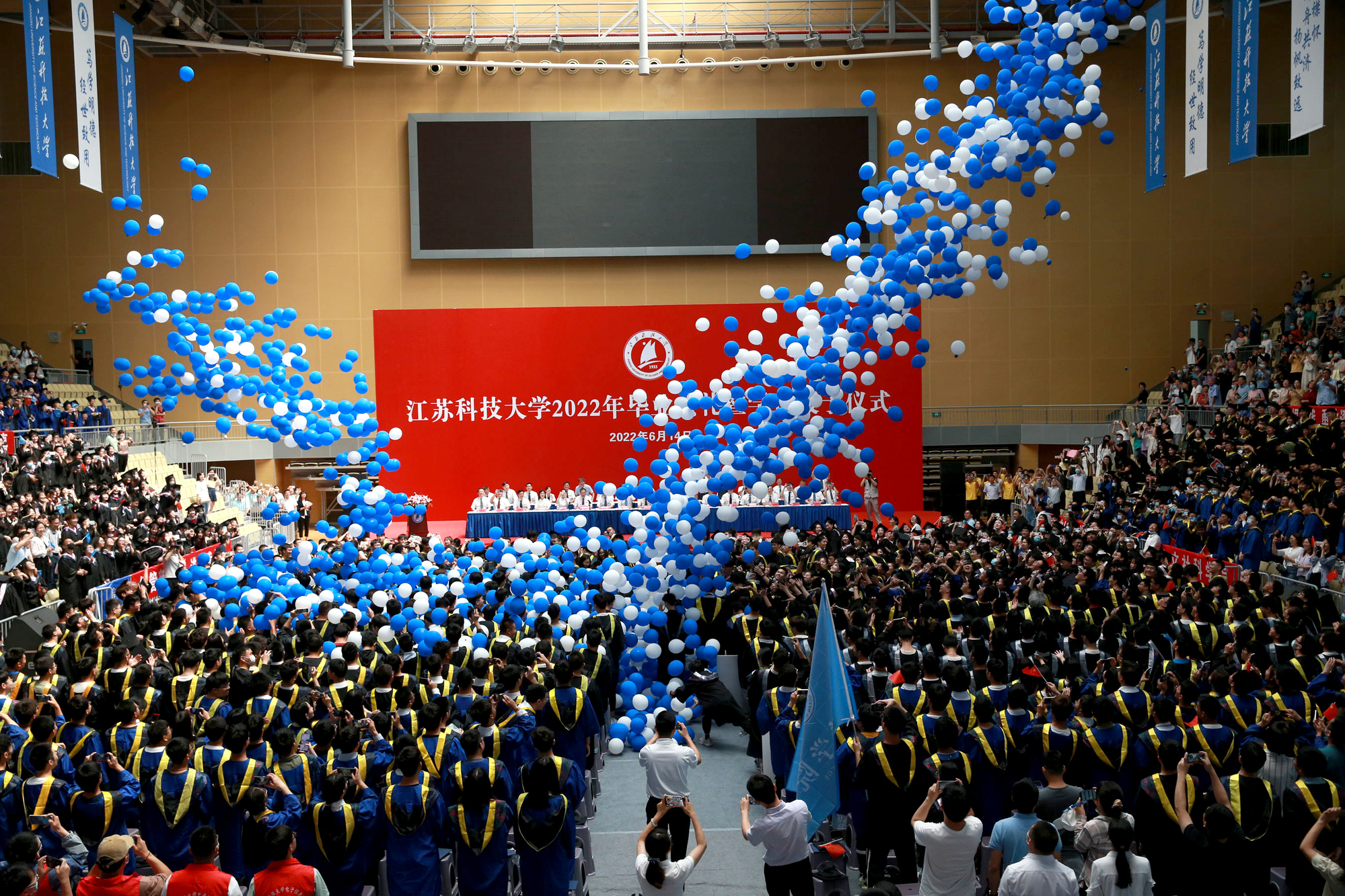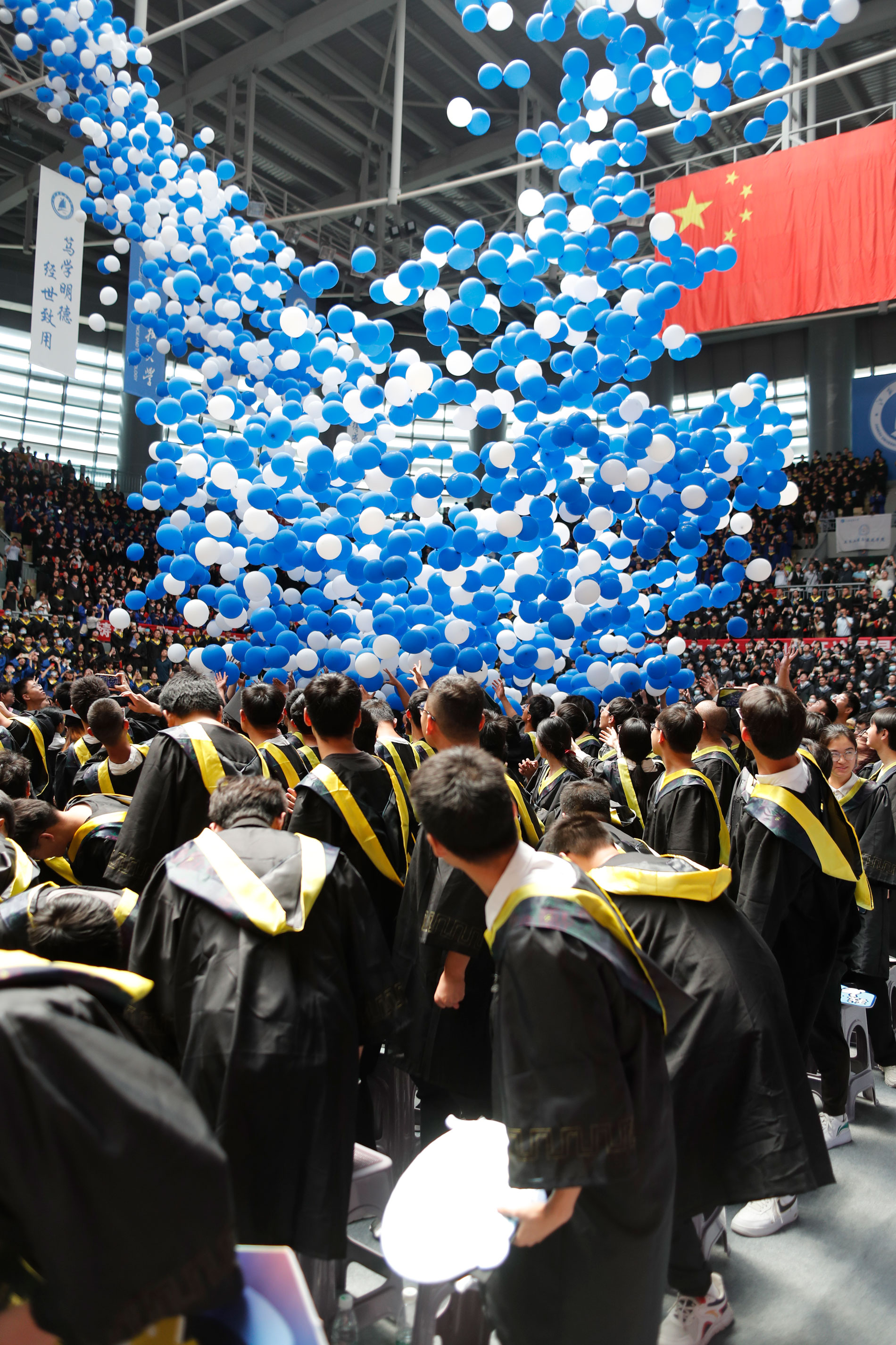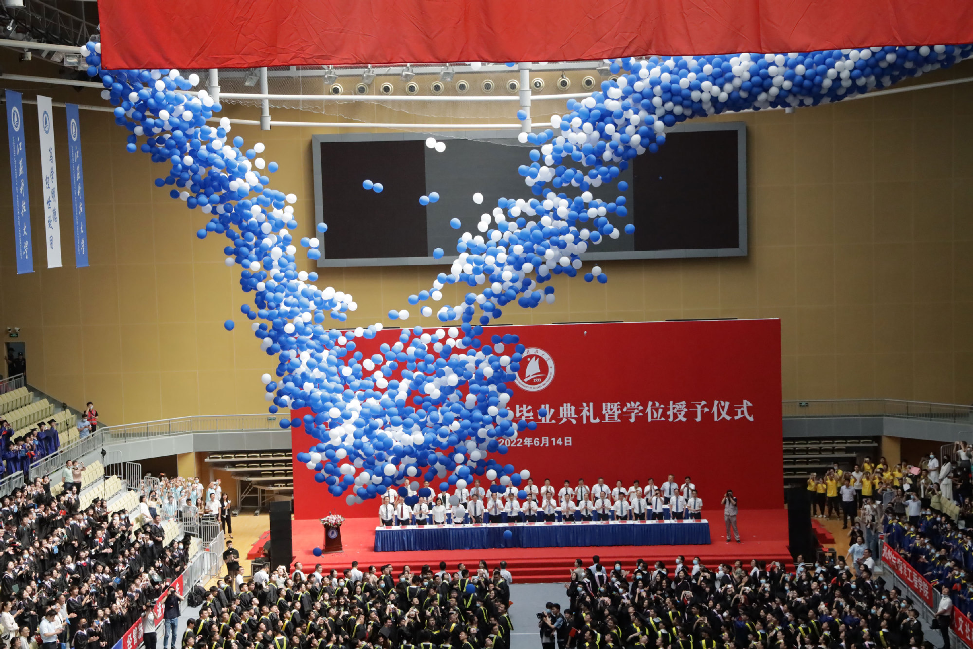 在球盟会qmh网站校歌声中,数千只蓝白相间的彩色气球从高空缓缓散落,仿佛跃腾的海浪,将现场氛围感拉满。伴着一路欢歌,庄重的学位授予仪式开始,毕业生依次上台领取学位证书,学位委员会全体导师为他们一一拨穗,圆满完成学位授予仪式。