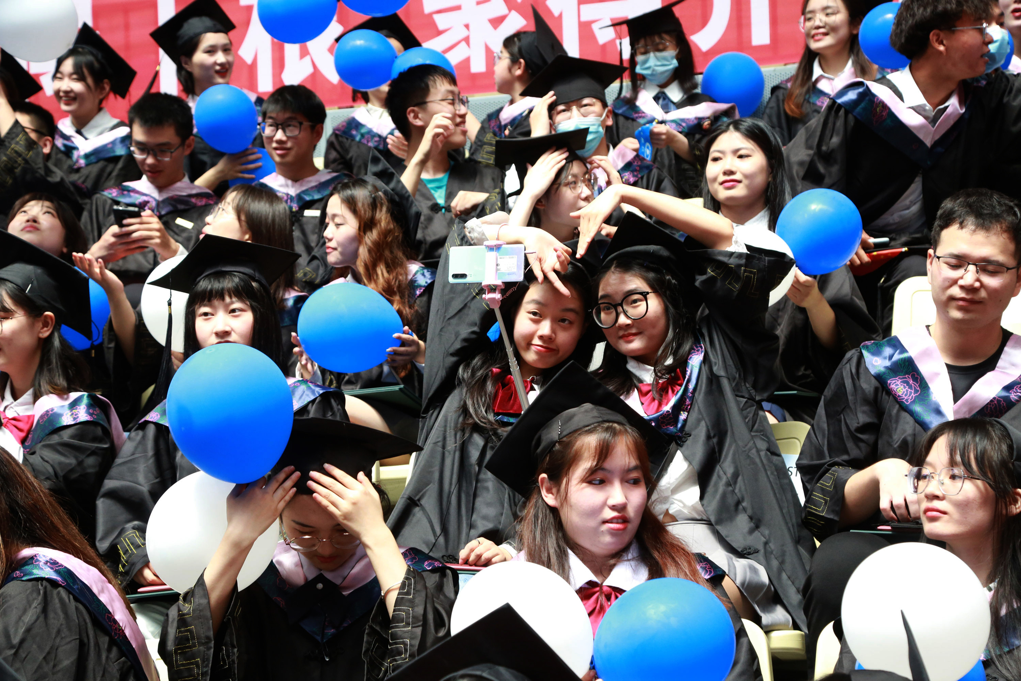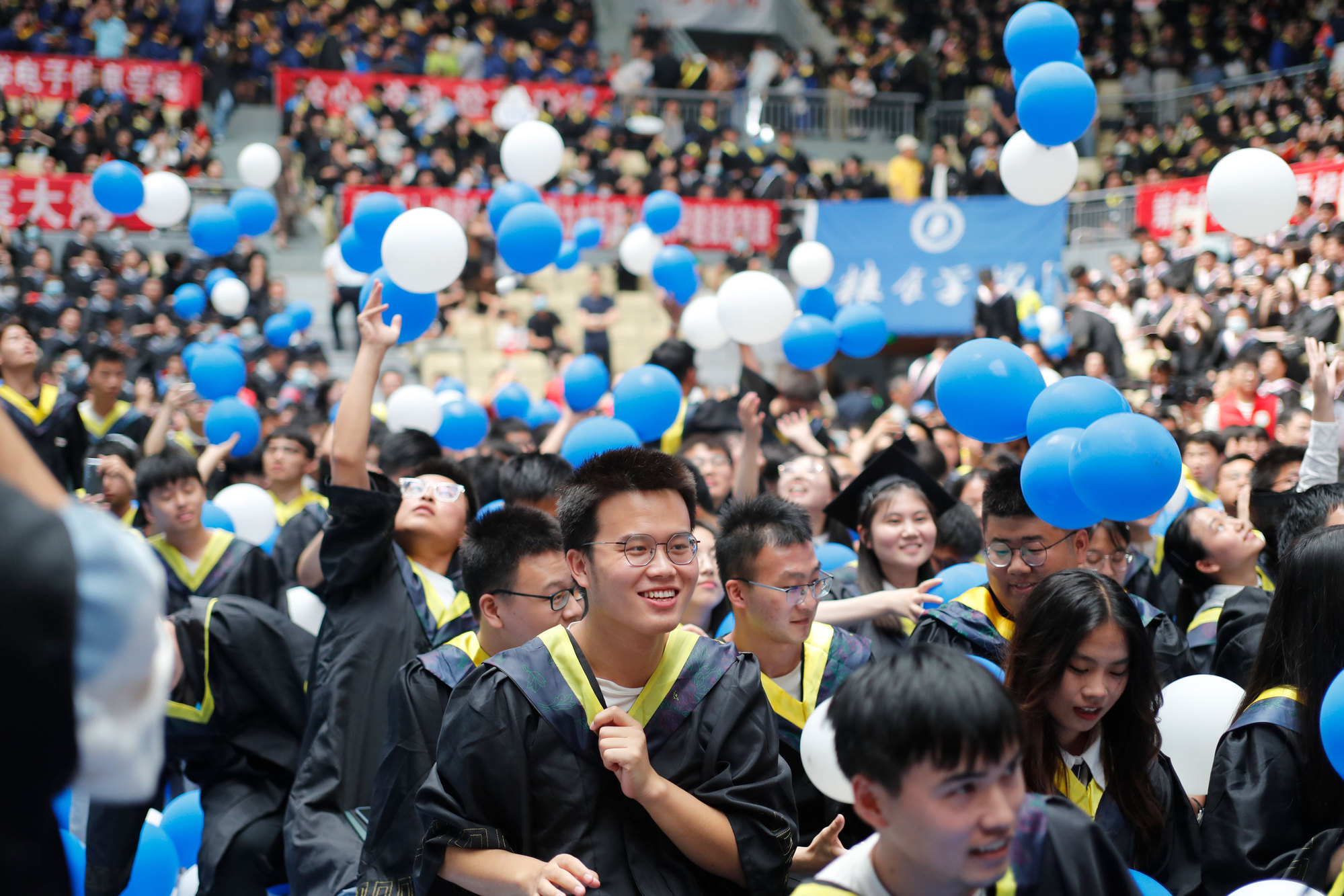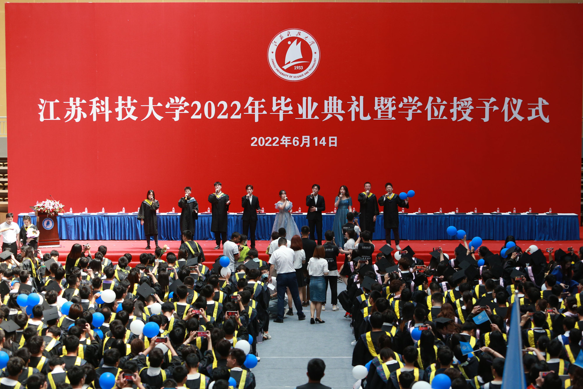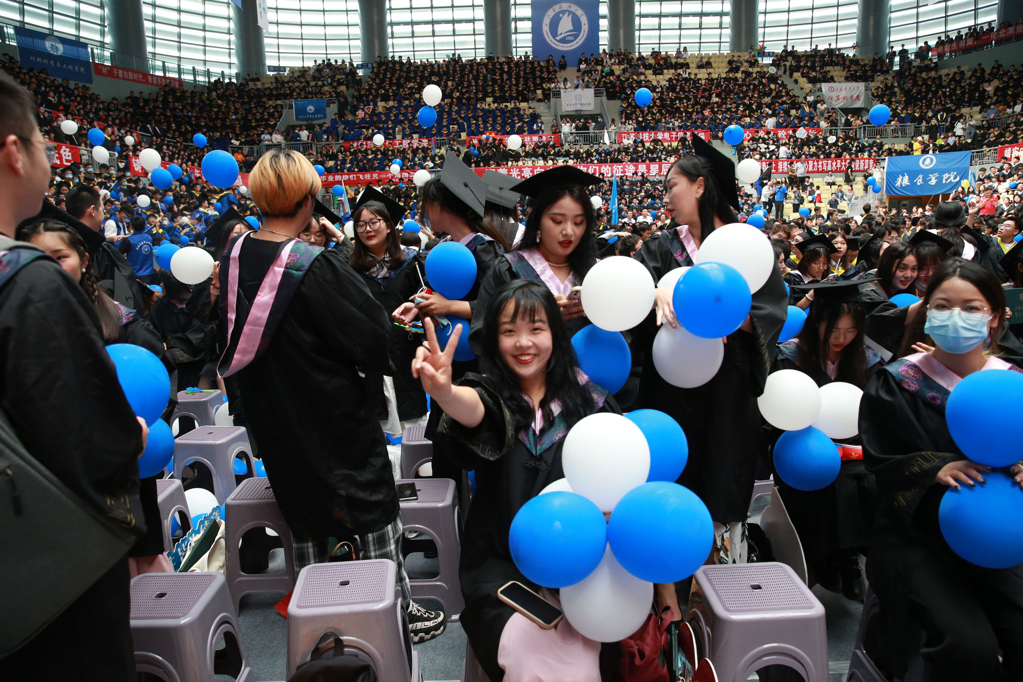 在球盟会qmh网站校歌声中,数千只蓝白相间的彩色气球从高空缓缓散落,仿佛跃腾的海浪,将现场氛围感拉满。伴着一路欢歌,庄重的学位授予仪式开始,毕业生依次上台领取学位证书,学位委员会全体导师为他们一一拨穗,圆满完成学位授予仪式。