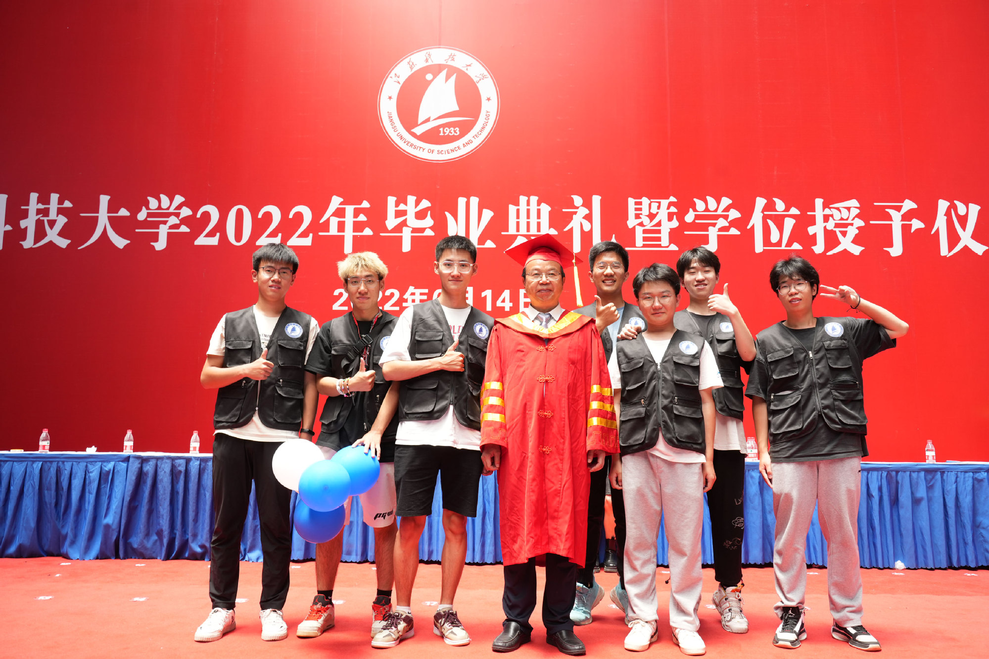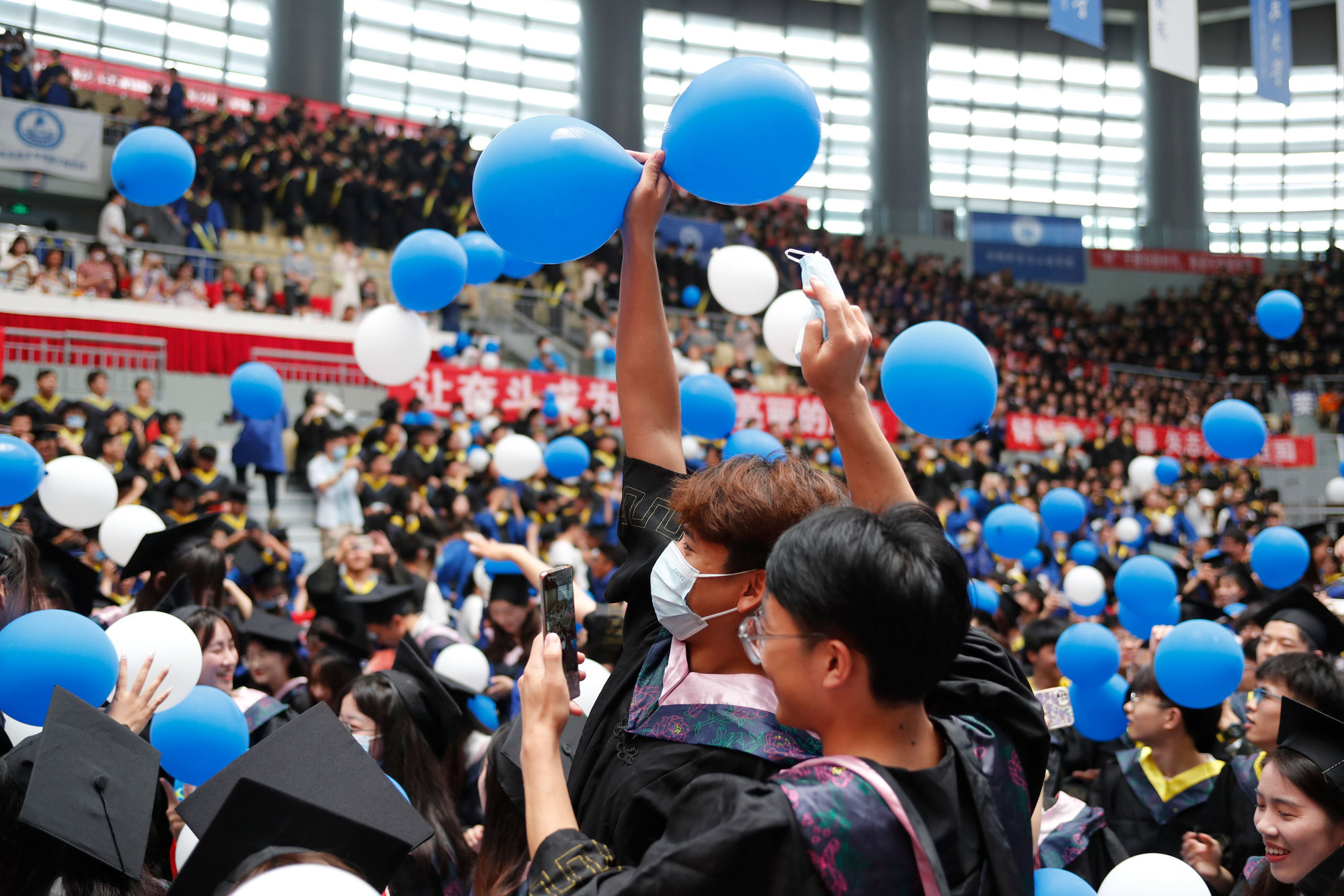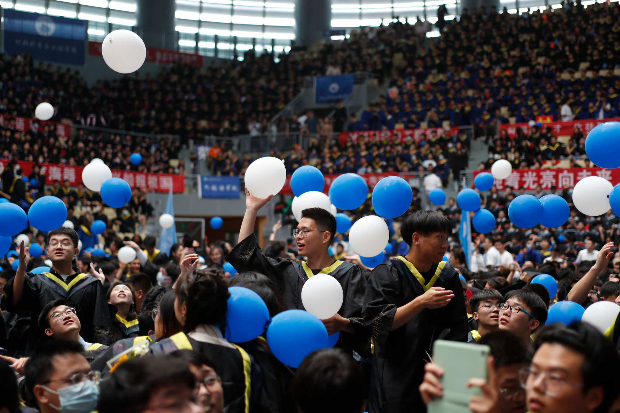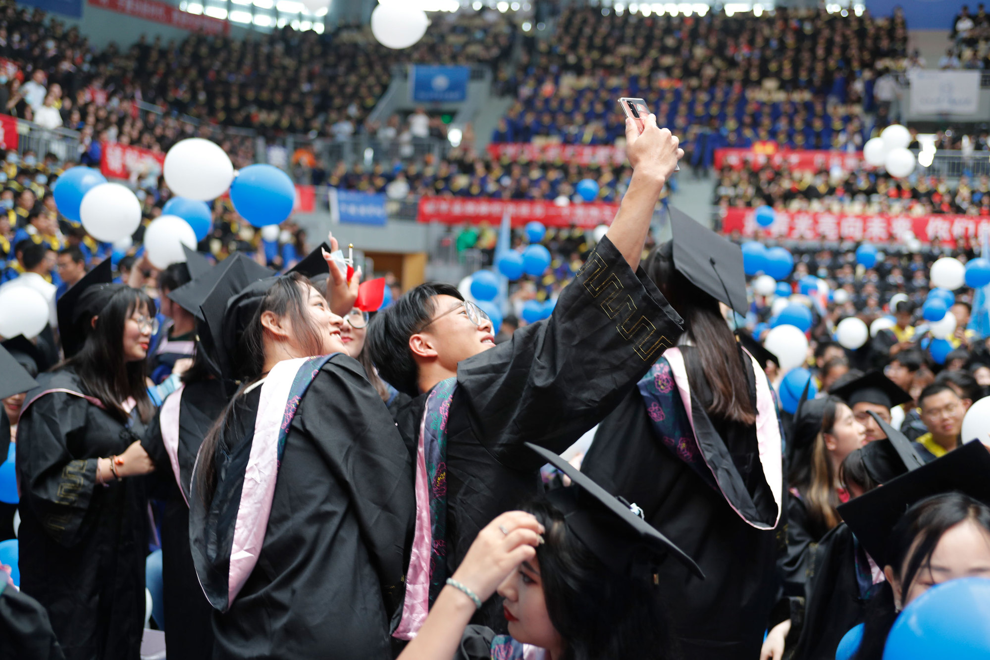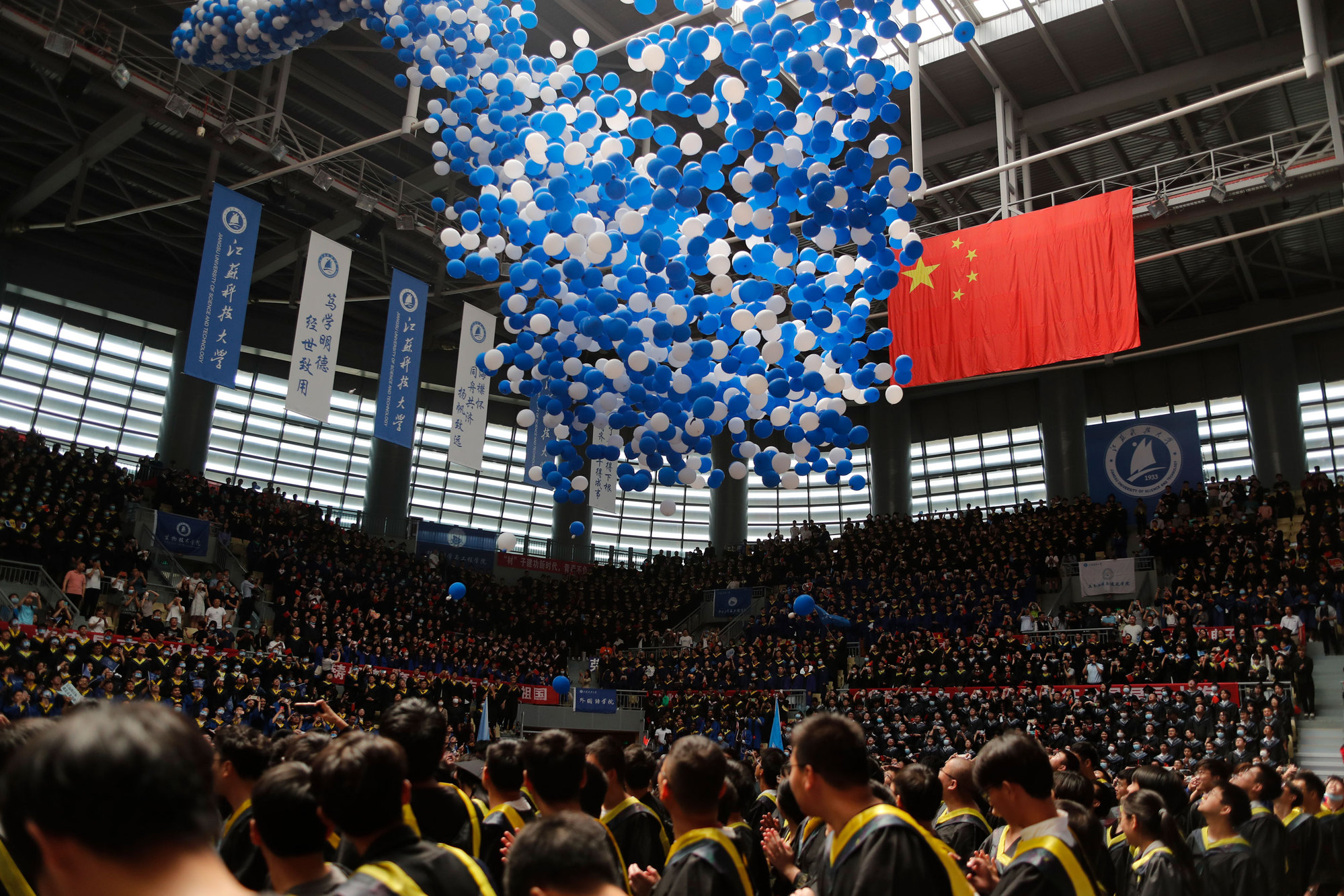 在球盟会qmh网站校歌声中,数千只蓝白相间的彩色气球从高空缓缓散落,仿佛跃腾的海浪,将现场氛围感拉满。伴着一路欢歌,庄重的学位授予仪式开始,毕业生依次上台领取学位证书,学位委员会全体导师为他们一一拨穗,圆满完成学位授予仪式。