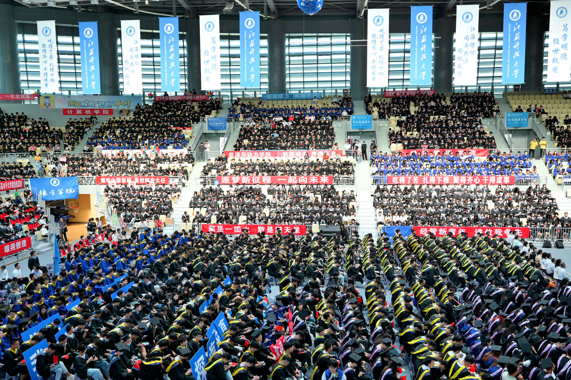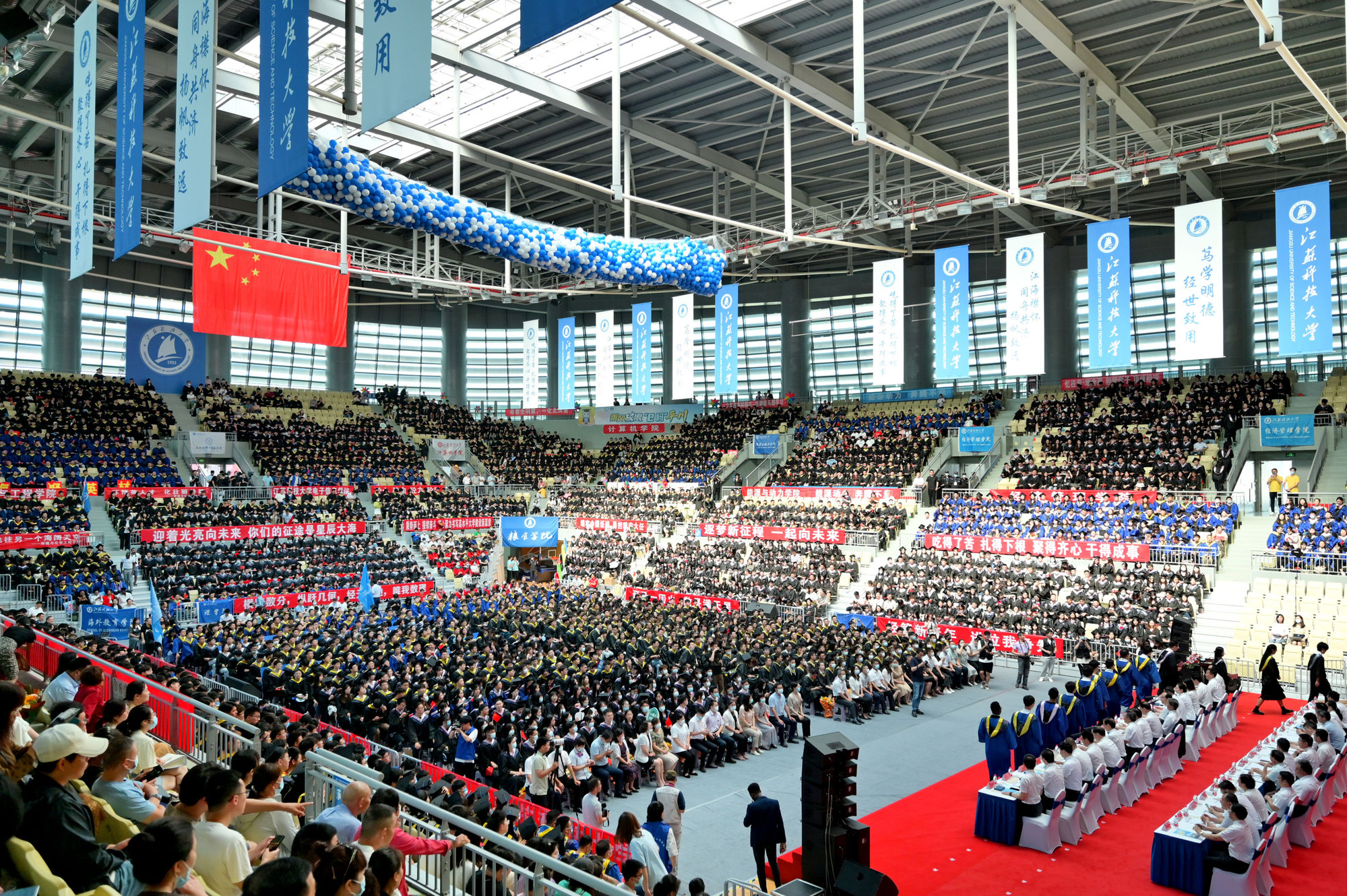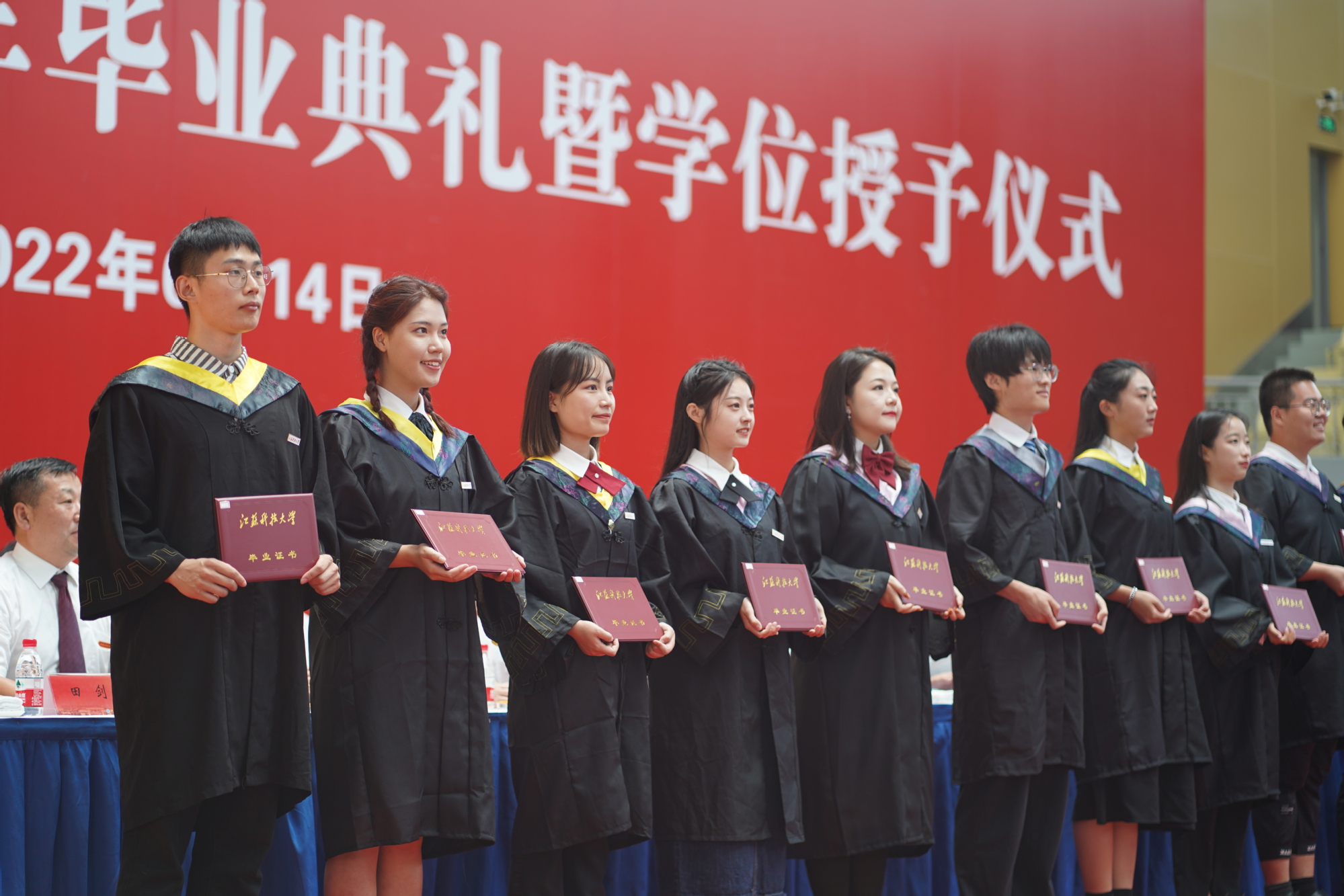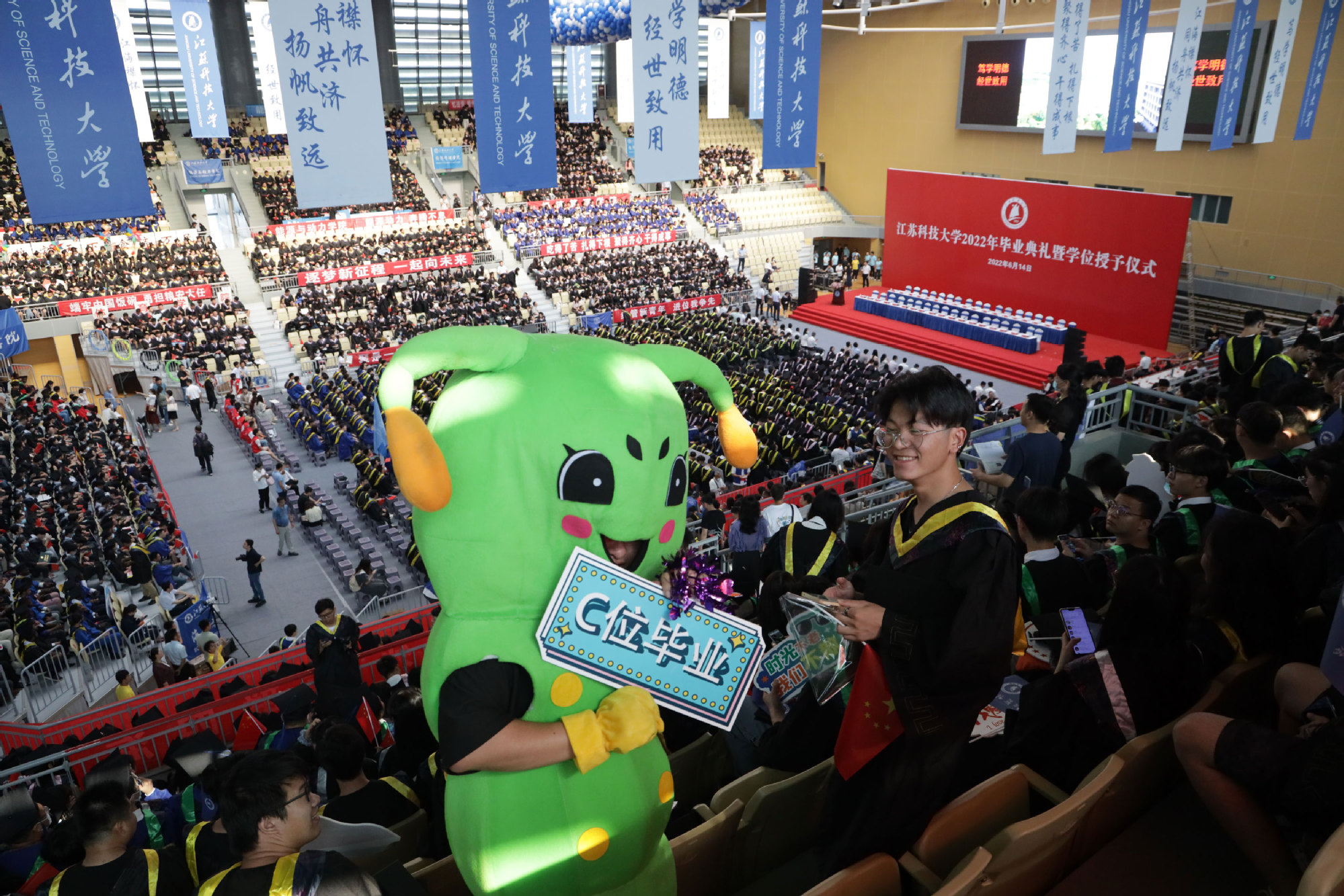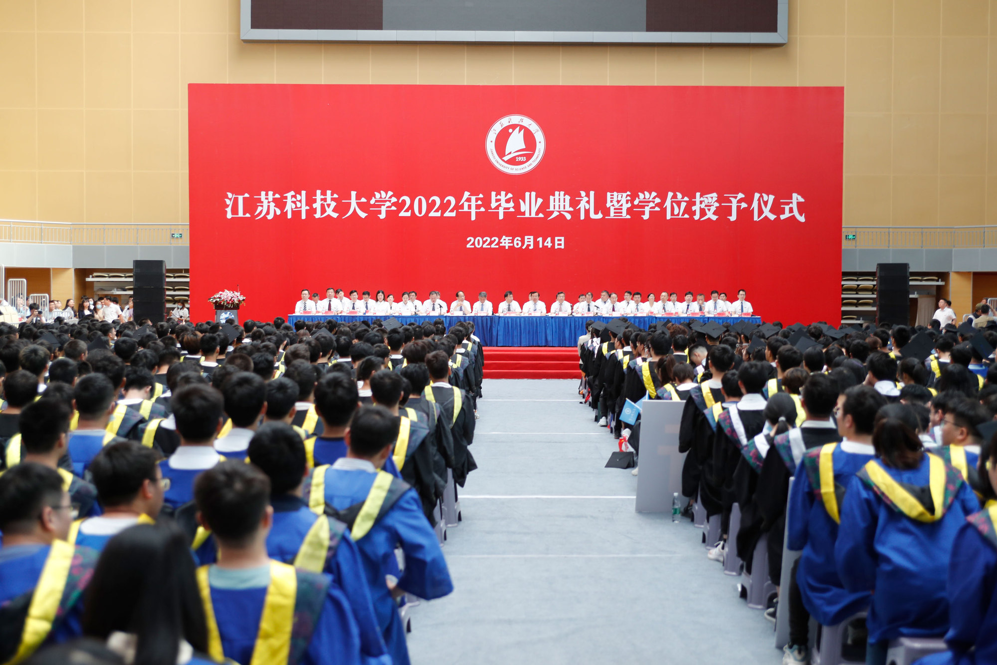 毕业典礼主会场设镇江大学城共享体育馆,张家港校区设置视频分会场。学校在官方微信视频号、B站、抖音、微博等平台开设直播,和同学们在线实时分享现场的喜悦与毕业收获。校党委书记葛世伦,校长周南平,qmh官网1990届校友、扬州中远海运重工有限公司总经理翟亚军,校领导景旭文、许俊华、王加友、郑培钢、任南,校党委常委李恒川、周春燕、刘新波,球盟会qmh网站学位委员会各位导师、2022届毕业生、全体辅导员和班主任,导师和教职工代表,家长代表、校友代表、用人单位代表,热情相聚与2022届毕业生深情话别。校党委常委、副校长俞孟蕻在张家港校区分会场出席典礼,张家港校区相关部门、部分教师、家长代表、毕业生465人参加了现场典礼,因疫情原因不能参加典礼现场的毕业生及家长通过线上的方式收看了毕业典礼直播,同步感受毕业典礼“仪式感”。