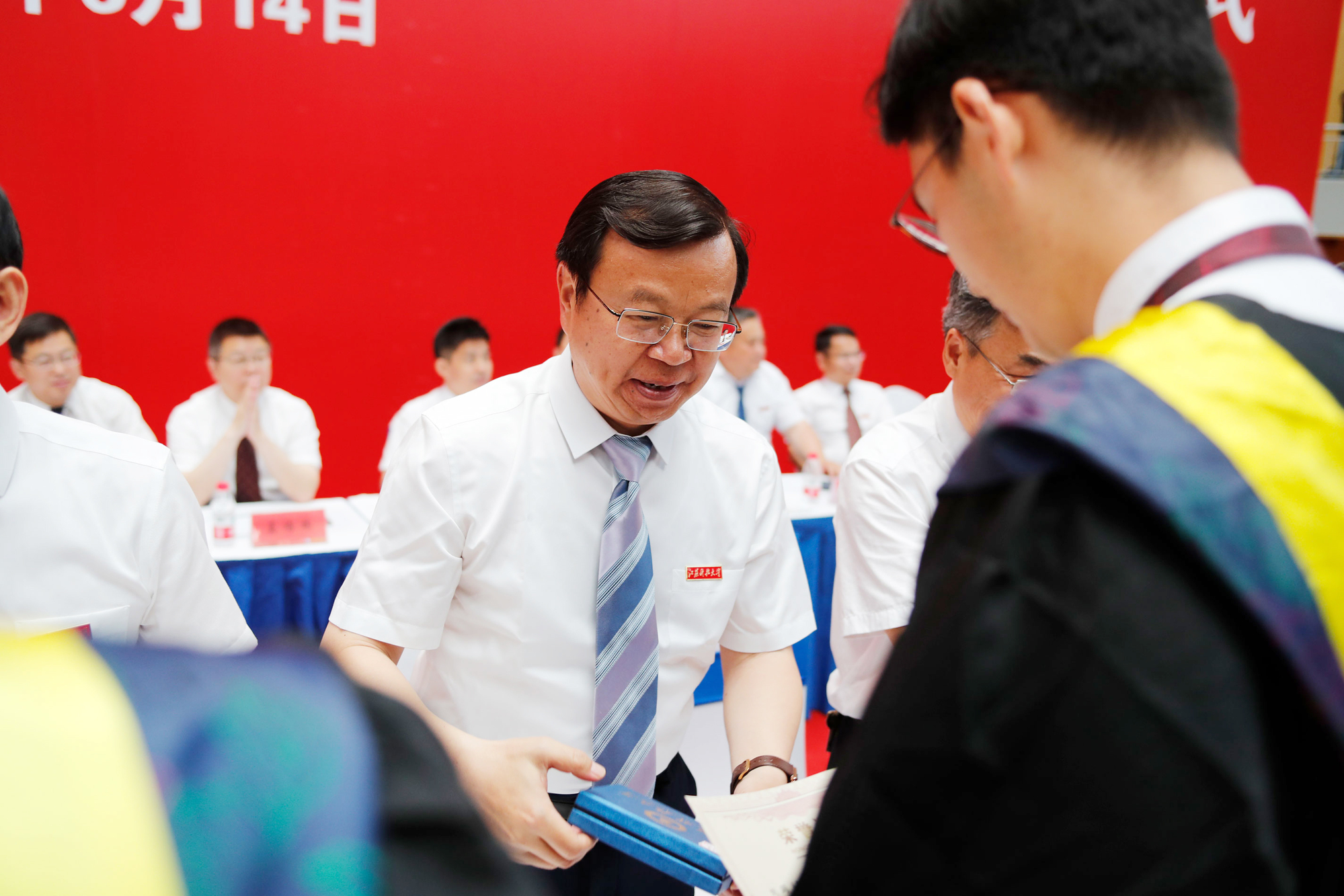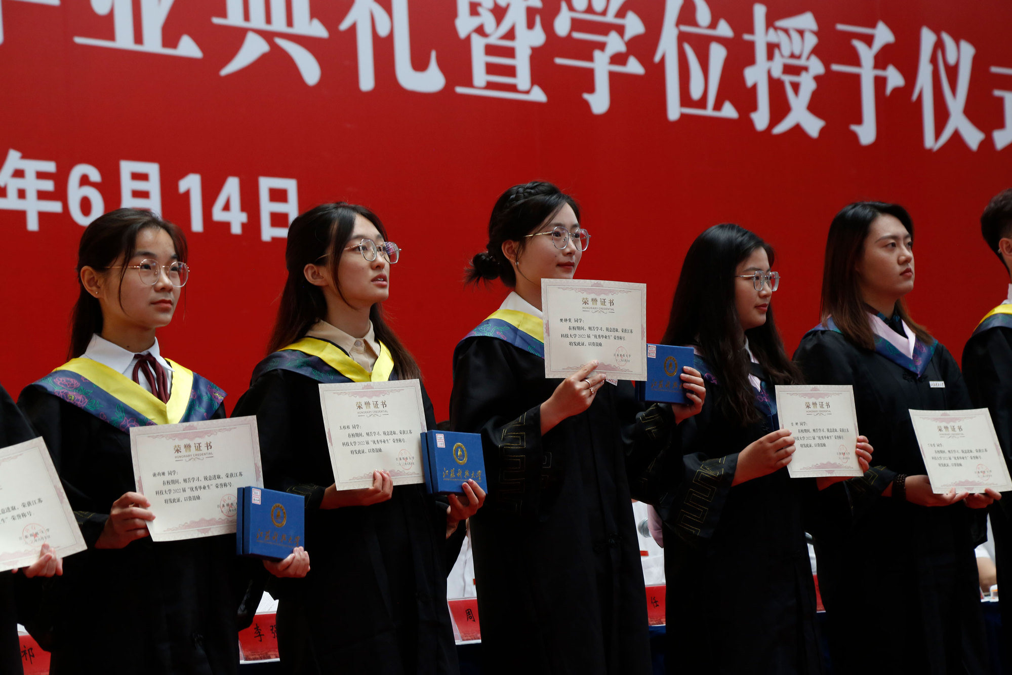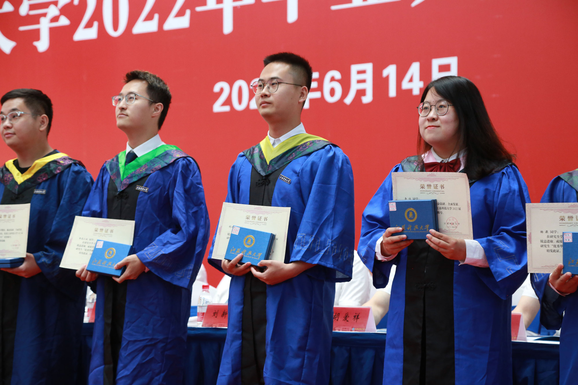 党委常委、副校长任南宣读《关于准予2022届本科学生毕业的决定》《关于授予2022届本科毕业生学士学位的决定》。副校长王加友宣读《关于准予2022届博士、硕士研究生毕业的决定》和《关于授予2022届研究生博士学位、硕士学位的决定》。校党委副书记、副校长景旭文宣读《关于表彰球盟会qmh网站2022届本科“优秀毕业生”的决定》《关于表彰球盟会qmh网站2022届研究生“优秀毕业生”的决定》。校领导和导师们为毕业生代表发放毕业证书,为优秀毕业生颁发荣誉证书、赠送毕业印章。