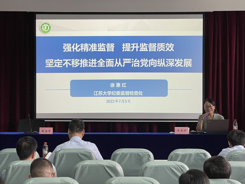 本次集中培训特别邀请了江苏大学监督检查处处长徐惠红以《强化精准监督 提升监督质效 坚定不移推进全面从严治党向纵深发展》为题作监督业务专题辅导,徐处长从正确理解监督、准确把握高校党风廉政建设新挑战、强化精准监督等方面,深入浅出地系统阐述了当前高校监督工作的重点难点、存在问题与不足,并提出意见建议。