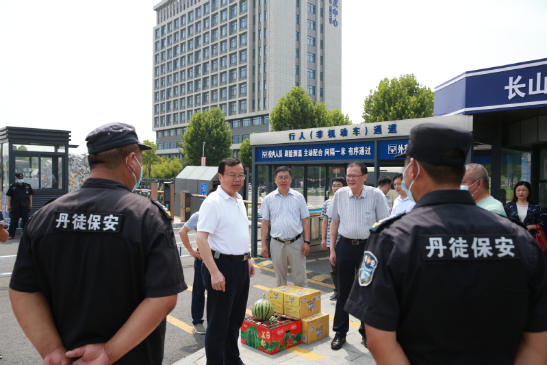 在文理大楼物业中心,周南平校长与物业管理人员一一握手表示感谢,他说,大家为美化校园出力流汗,让校园美了,师生心情舒畅了,江科大的美丽校园有大家辛勤的汗水,酷暑之中,大家也要做好自我防护,根据天气情况调整作息时间。