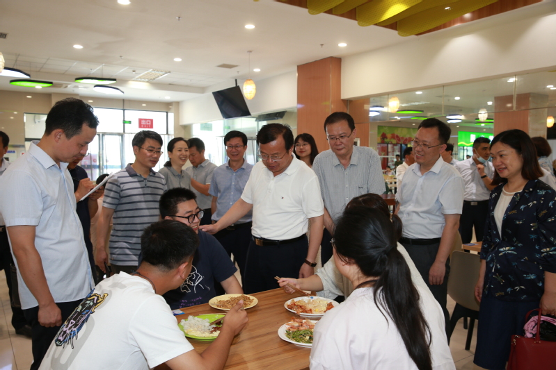 在东苑食堂一楼,周南平校长与用餐师生交流,“菜价是否贵了?”“菜的口味是否还满意?”“一定要注意营养。”……他表示,后勤的菜品要丰富调整,要根据学生的兴趣满足不同口味需求,要努力让每一餐都有同学们喜欢的菜,同时要把食品卫生安全放第一位,服务保障不打折。
