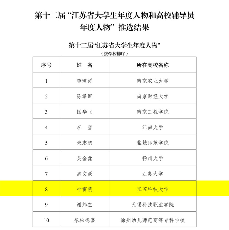 近日,江苏省委教育工委、省教育厅公布了第十二届“江苏省大学生年度人物和高校辅导员年度人物”暨2022年“最美大学生”“最美高校辅导员”推选结果,qmh官网环境与化学工程学院2021级硕士研究生叶雷凯荣获第十二届江苏省“大学生年度人物”。