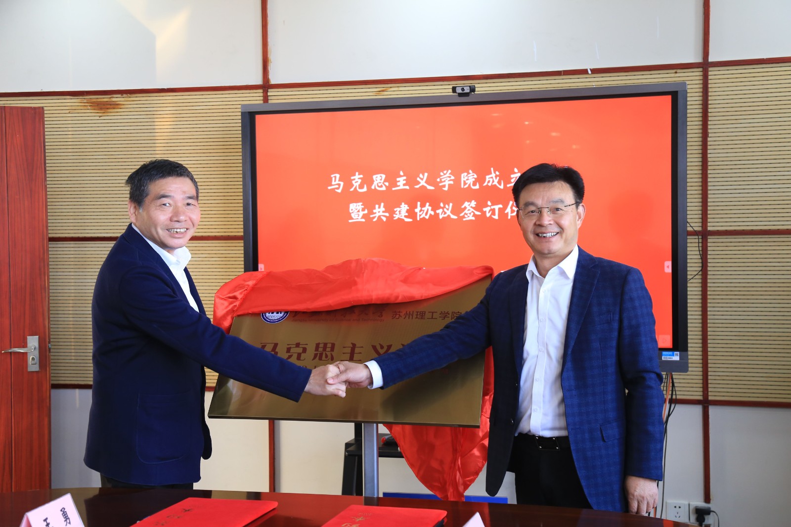 李恒川致辞表示,党的十八大以来,党中央、教育部对新时代高校思想政治教育工作高度重视,2021年9月,教育部明确提出了加强新时代高校马克思主义学院建设的举措和要求,苏州理工学院领导班子高度重视,经过一年多的悉心筹备,马克思主义学院正式成立并开始工作运营。王志东宣读了苏州理工学院关于成立马克思主义学院及相关人员任命的文件。谈镇、李恒川为马克思主义学院揭牌。