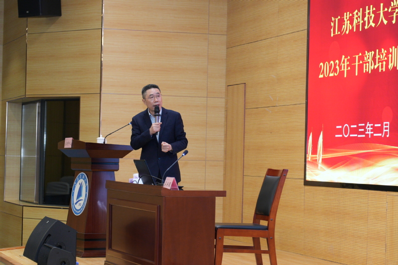 党的二十大,站在“关键在党、关键在人”的高度,对深入推进新时代党的建设新的伟大工程作出全面部署,提出“建设堪当民族复兴重任的高素质干部队伍”的重大任务。葛世伦从“习近平总书记关于干部队伍建设的重要论述”引入,介绍了好干部新的时代内涵、怎样才是好干部、怎样成为好干部、把新时代好干部标准落到实处,分析了中层干部换届后的干部队伍结构,阐述了“江科大干部应具备的能力素质”,包括鲜明的政治品格、深厚的师生情怀、强烈的机遇意识、过硬的专业素养、科学的系统观念、敏感的数字思维、坚韧不拔的毅力。葛世伦还结合自身工作经历和丰富的管理实践,具体说明“如何成为一名优秀的管理干部”,要敬畏岗位,岗位成就事业;要加强学习,锤炼履职本领;要培养品格,提高自身修养。他倡议,“奋力谱写江科大高水平大学建设新篇章”,在“准确把握中国式现代化对教育的要求、准确把握高等教育的使命、准确把握江科大的发展使命”基础上,推进学校高质量发展。