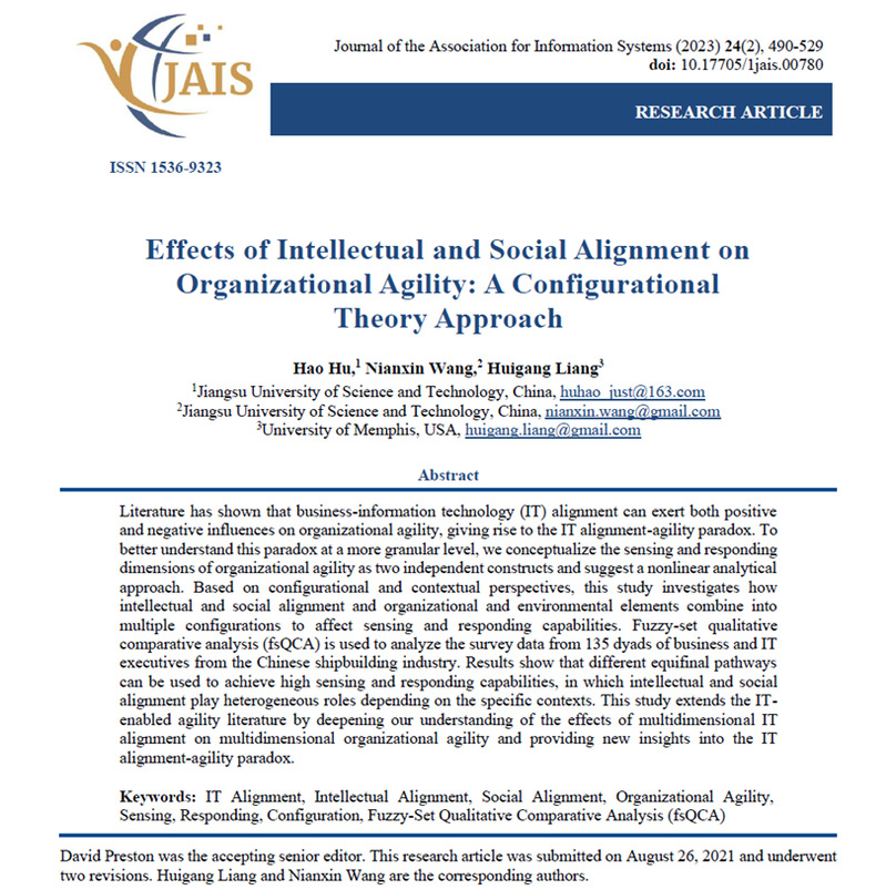 近日,学校经济管理学院管理科学与工程专业博士研究生胡皓为第一作者、导师王念新教授为第二作者,美国孟菲斯大学Huigang Liang教授为共同通讯作者的研究成果“Effects of Intellectual and Social Alignments on Organizational Agility: A Configurational Theory Approach”,发表在信息系统学科顶级期刊Journal of the Association for Information Systems,球盟会qmh网站为论文的第一作者单位。