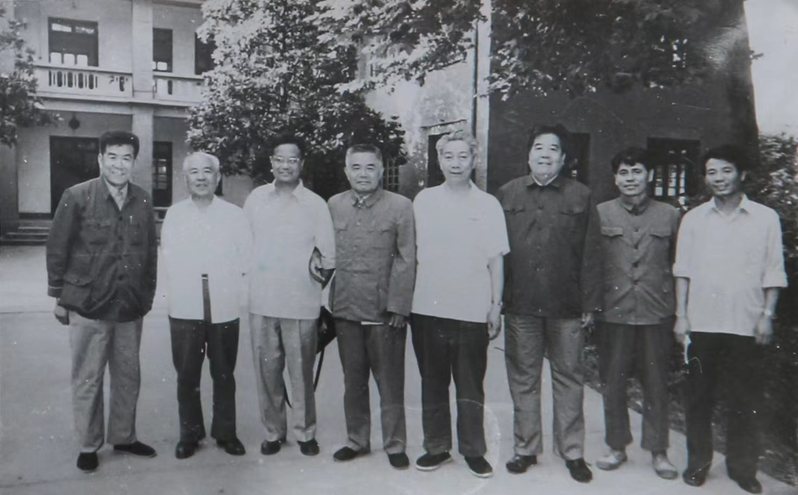 1982年6月,中船总公司有关领导视察镇江船舶学院,院领导陪同合影(左一刘东明、左三杨槱、左五肖流)