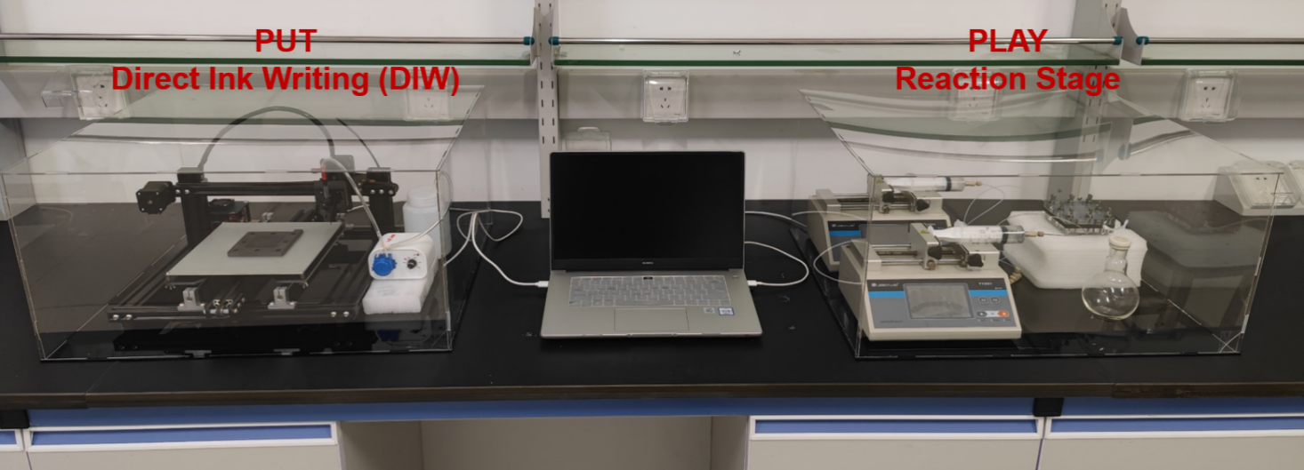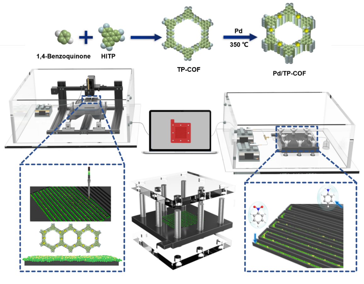 本工作报道了一种开放式的自动化实验平台(以下称PPAM),该平台分为“Put”和“Play”两个部分:“Put”区块首先通过3D扫描仪快速建模非封闭通道模块,继而在优化通道路径后使用载有催化剂墨水的书写笔进行全自动均匀涂覆,经过干燥和封装后模块被转移到“Play”区块进行所需反应,整个过程在完成器件组装、模块扫描、催化剂涂覆等过程一体化、智能化的同时,避免了传统微流控反应器中非均相催化剂的单一局限性。此外,PPAM凭借其开放且可组装串联的特点,可以根据场景需求进行不同类型的气液固三相反应,在本工作中仅通过催化剂和反应器结构的简单调整和调配,强化了共价有机框架(COF)层间的π-π堆叠相互作用,实现电荷迁移高效化的同时大幅度地提高了催化效率。