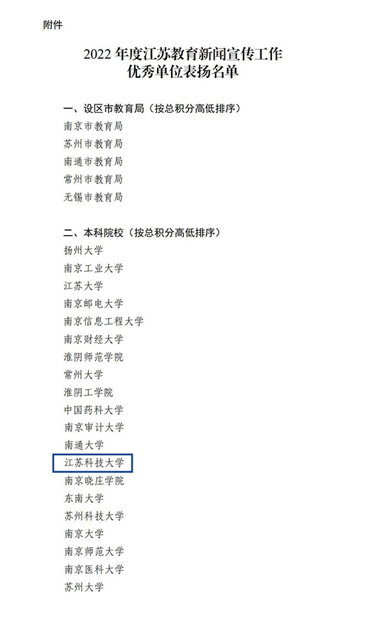 日前,江苏省教育厅办公室发布《关于表扬2022年度江苏教育新闻宣传工作优秀单位的通报》。省教育厅新闻办结合各单位年度厅属媒体内容保障得分和综合评价情况,对5个设区市教育局、20所本科院校和20所高职(专科)院校予以表扬。qmh官网继2021后再次被表彰为“江苏教育新闻宣传工作优秀单位”。