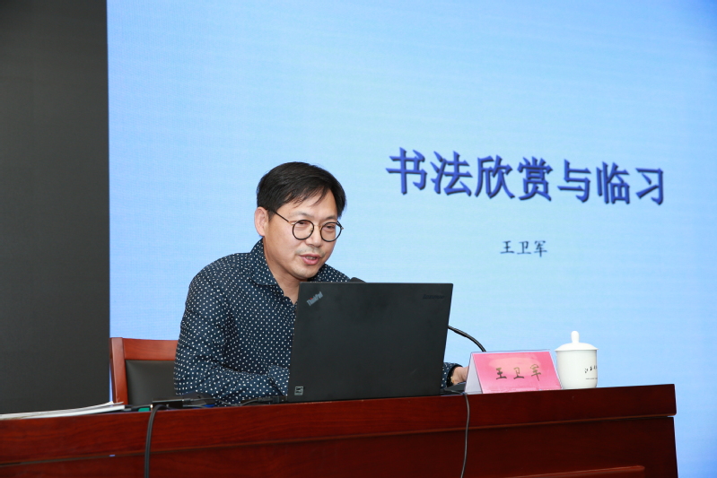 “作为一门独特的艺术形式,书法不仅具有艺术共性的社会功能,还因其以文字为书写内容和表现形式,而具有不可替代的文化价值……”王卫军从书法的内涵、书体的演变与发展谈起,将书法艺术与哲学思考相联系,阐释了书法的审美意趣,指导师生在书法整体形态、点画结构、墨色组合之间,体悟书法的韵律,感受书法之美。简单介绍学习书法的几点裨益后,王卫军通过讲解“临帖”的实用方法及注意事项来讲述如何学习书法,他鼓励师生从临帖中感受笔墨的乐趣,用书法写出这个时代朴素而有趣的灵魂。