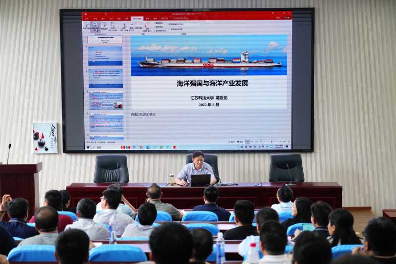 6月25日下午,校党委书记葛世伦教授为qmh官网举办的中国船舶集团有限公司第五期中层干部工商管理培训班作“海洋强国与海洋产业发展”专题报告。来自中国船舶集团53家成员单位的80名学员,以及学校党办、科研院、人文社科处、经济管理学院的部分中层干部和教师聆听了授课。