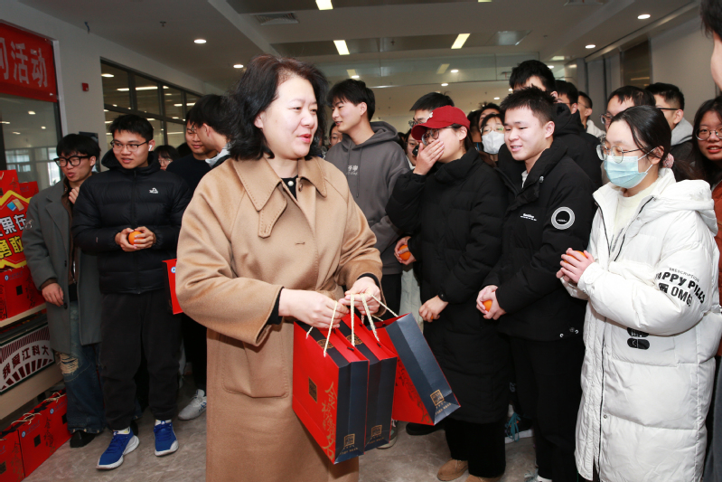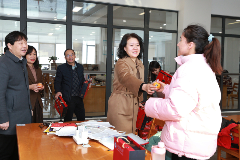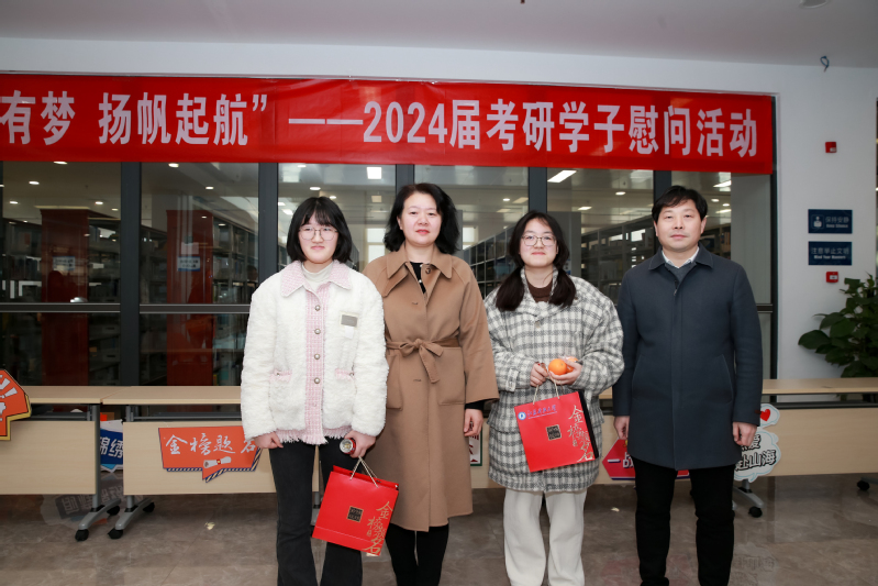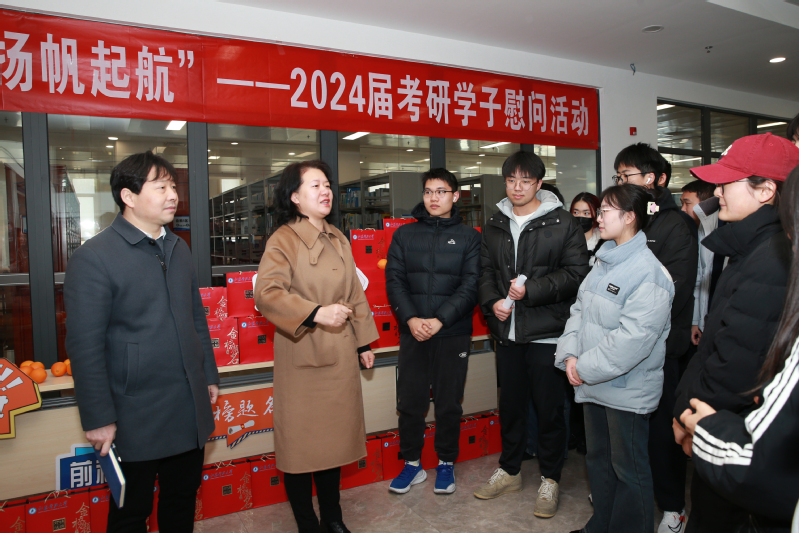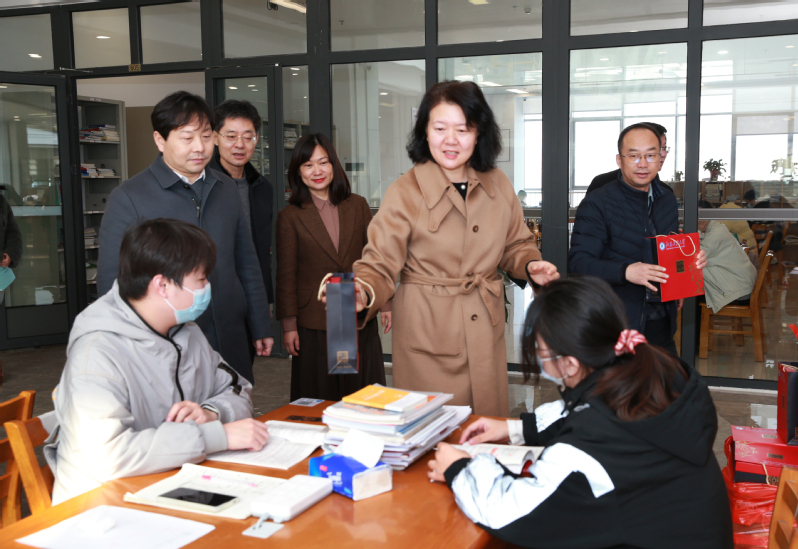 助力考研梦,情暖学子心。12月20日上午,校长嵇春艳,党委常委、副校长胡爱祥,党委常委、宣传部部长周春燕,校办、学生处、图书馆等职能部门的负责人共同走进图书馆考研自习室慰问正在复习备考的2024届考研学子,为即将踏上考研“战场”的学子们送去勉励和“暖心加油包”。