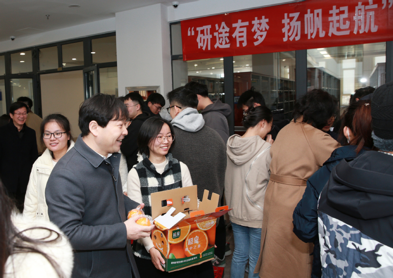慰问现场,嵇校长一行在图书馆为考研学子们送上“旗开得胜,一起加油”的祝福,对大家为梦想而拼搏的坚持表示赞扬。随后,与会领导一同为考研学子们送上精心准备的慰问礼品,其中包含“橙”功上岸——橙子、考研“旺旺”——旺仔牛奶、轻巧上岸——巧克力和金榜题名礼盒等,每一份礼品都饱含着学校对考研学子的深深祝福和殷切关怀。