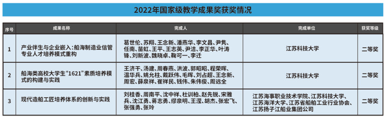 7月24日,教育部公布《2022年国家级教学成果奖获奖项目名单》。球盟会qmh网站《产业伴生与企业嵌入:船海制造业信管专业人才培养模式重构》《船海类高校大学生“1621”素质培养模式的构建与实践》等2项成果获高等教育(本科)国家级教学成果奖二等奖,学校作为第二完成单位参与的成果《现代造船工匠培养体系的创新与实践》获职业教育国家级教学成果奖二等奖。实现学校国家级教学成果奖历史性突破,激励广大教师投身教学研究与实践,进一步深化教育教学综合改革。