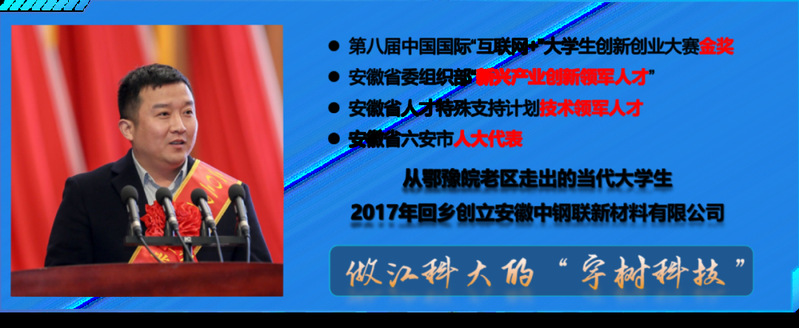 【人物简介】吕林,安徽省委组织部新兴产业创新领军人才,安徽省高层次人才;从鄂豫皖老区走出的当代大学生,获第八届中国国际”互联网+”大学生创新创业大赛金奖,回乡创立安徽中钢联新材料有限公司,球盟会qmh网站2014届材料学院校友。