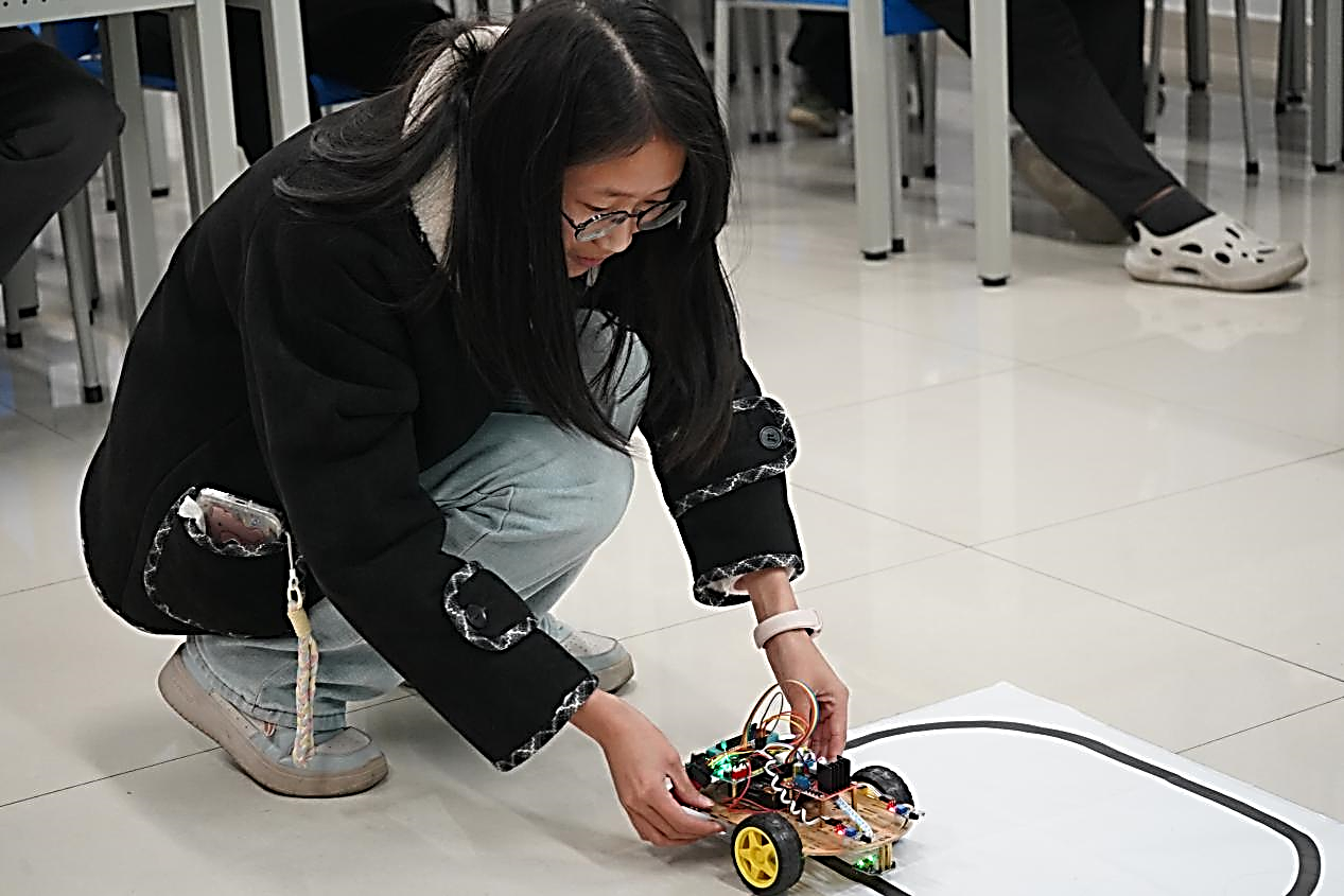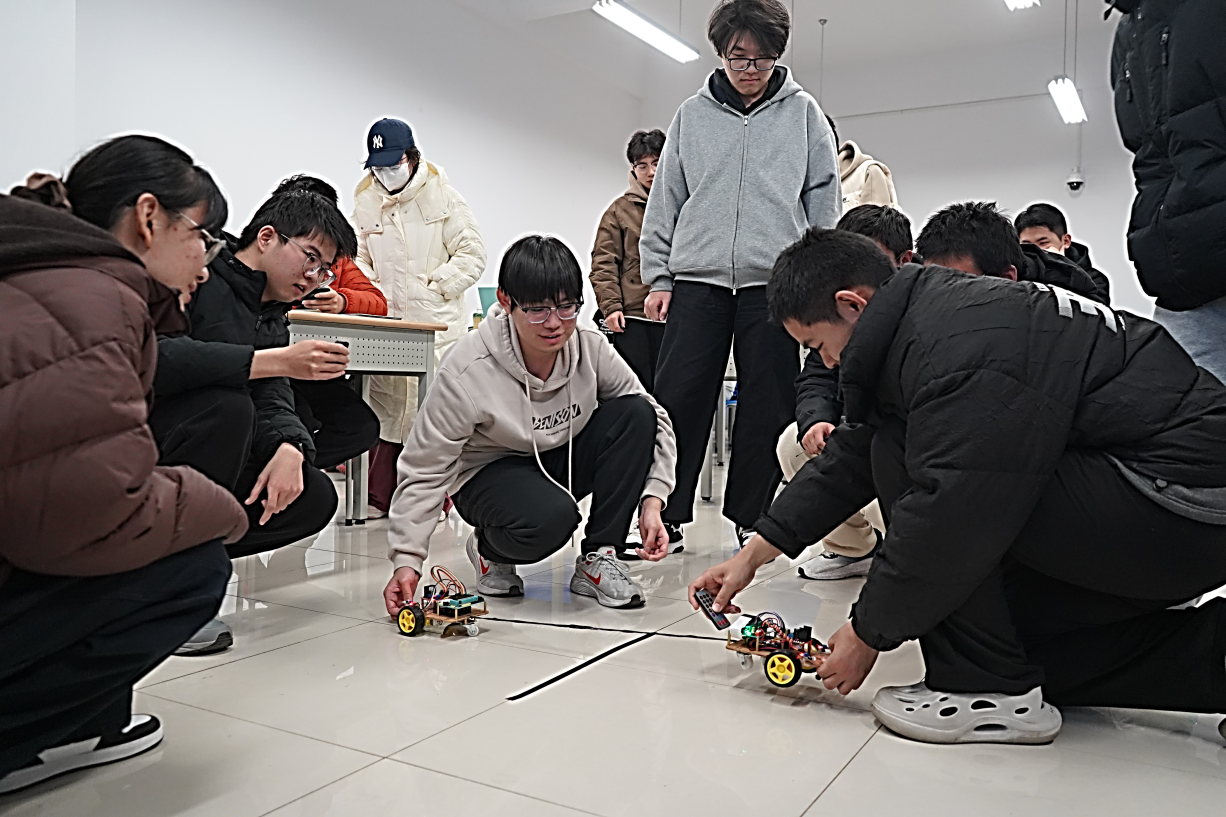 在智能车组验收环节中,除了常规的性能核验外,特色的智能车拔河项目也同步开展,这一环节旨在精准检验车辆动力输出稳定性与整体运行可靠性,现场交流氛围浓厚。该环节不仅搭建了实践成果的展示平台,也促进了嵌入式和智能控制领域的技术交流,切实提升了同学们的工程实践能力和创新思维。