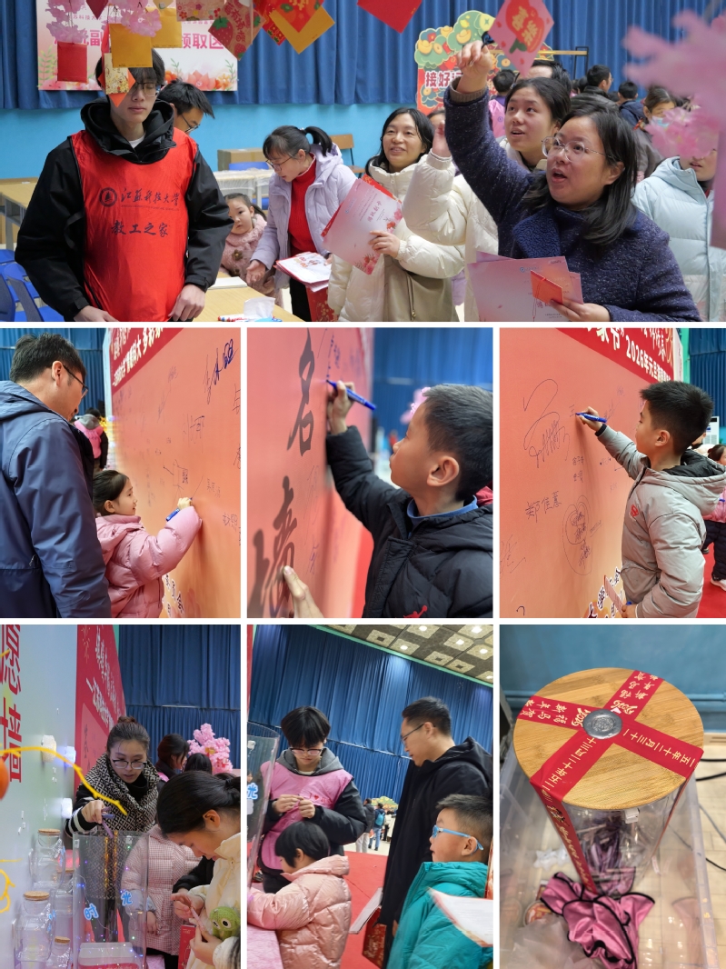 新春祈福区内,暖意与祝福交织。“时光胶囊”愿望墙前,大家踊跃执笔题名,在彩笺上细细书写对新年的憧憬、对学校的祝福,投入许愿瓶中封存,待来年启封之时,赴一场与美好的重逢;“最美瞬间”打卡点内,新年元素点缀的创意相框、卡通立牌与可擦写宣言板相映成趣,亲子依偎、笑语定格,每一张合影都是时光里最珍贵的馈赠;“驰跃宏图”祈福树上,七彩利是封缀满花枝,内藏精巧的新年钥匙扣、典雅国风金属书签等精致纪念品,更有工会工作人员和大学生志愿者亲手叠制的粉色爱心,每一份都承载着独一无二的美好祝福。参与者亲手击中获取的瞬间,双倍的欢喜悄然降临。