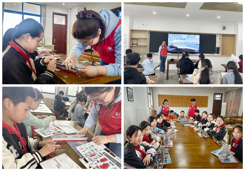“原来海军节背后有这么多热血故事!”活动现场,研究生骨干们化身“深蓝讲解员”,用生动通俗的语言、详实鲜活的图文,为孩子们讲述人民海军从无到有、由弱到强的壮阔征程。驱逐舰、护卫舰……一艘艘“海上长城”的故事,让孩子们目不转睛、争相提问。最热闹的莫过于船模拼装环节,志愿者们手把手指导小朋友拼接立体军舰拼图。拆零件、卡位、组合……孩子们全神贯注,小手翻飞。当一艘艘精致的军舰模型在掌心成型,自豪的笑容绽放在每一张小脸上。“我长大也想开军舰!”一个小男孩兴奋地喊道。