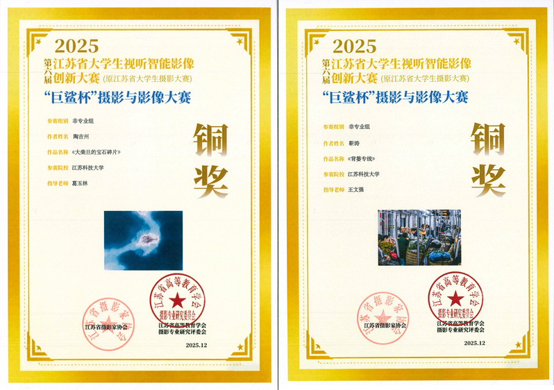 2026年4月23日,第六届江苏省大学生视听智能影像创新大赛颁奖典礼在南京传媒学院大讲堂隆重举行。qmh官网2024级船舶与海洋工程专业陶吉州同学的摄影作品《大柴旦的宝石碎片》、2023级人文社科学院公共事业管理专业靳涛同学的摄影作品《背篓专线》双双荣获非专业组铜奖,指导教师葛玉林、王文强获评“优秀指导老师”。