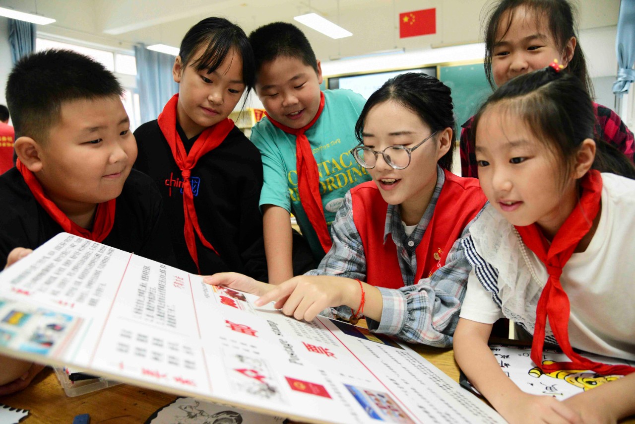 10月8日,在江苏省镇江市润商小学,球盟会qmh网站志愿者在为小学生讲解邮政知识。(石玉成 摄)