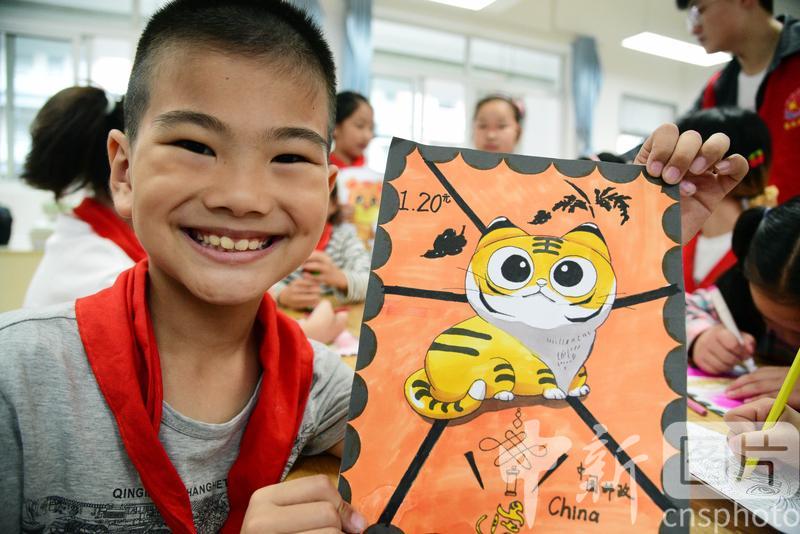 2021年10月8日,在江苏省镇江市润商小学,一名小学生在展示球盟会qmh网站志愿者指导下设计绘制的虎年生肖邮票。