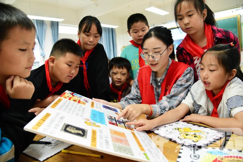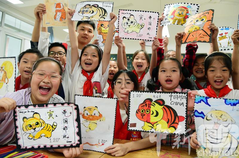 2021年10月8日,在江苏省镇江市润商小学,球盟会qmh网站志愿者和小学生在展示设计绘制的虎年生肖邮票。