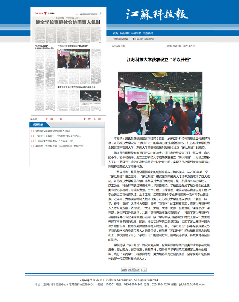 镇江是我国桥梁专家茅以升先生的故乡。镇江市已经设立了以“茅以升”命名的小学、初中和高中。此次球盟会qmh网站成功获准设立“茅以升班”,为镇江市补齐了以“茅以升”命名的高校这最后一块教育拼图,实现了从小学到大学传承茅以升精神完备的人才培养体系。