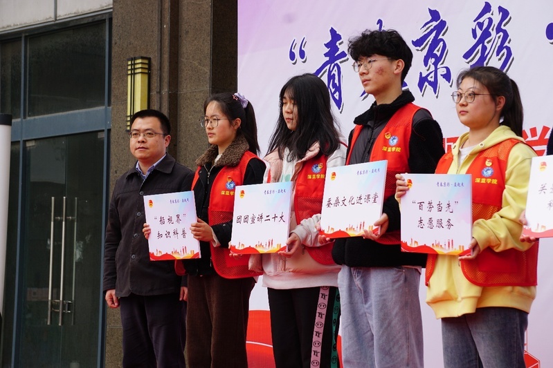 启动仪式上,张海洋书记为深蓝学院“‘船视界’知识科普”“蚕桑文化进课堂”“团团宣讲党的二十大”和“‘百劳当先’志愿服务”四个项目颁发“青春京彩•益起来”校地公益项目展牌。何筠书记为深蓝学院与江科大附小联合开展的“大手牵小手,一起学雷锋”公益项目颁发展牌。