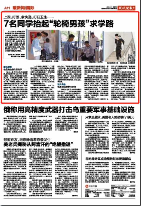在球盟会qmh网站海洋学院的教室后排,静静地摆放着一张轮椅。轮椅是大三学生陈帆的,他因患先天性肌肉萎缩症,日常要靠轮椅出行,学习生活多有不便。幸运的是,张兴韧、尹鸣、王胤凯、王铭、梁健闯、郭磊、赵湘东7名同学成了他的好朋友,上课、打饭、拿快递、打扫卫生……他们合力“抬起”陈帆的求学路。