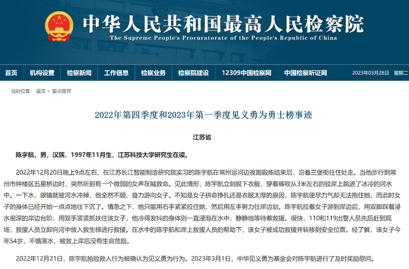 中华人民共和国最高人民检察院:2022年第四季度和2023年第一季度见义勇为勇士榜事迹