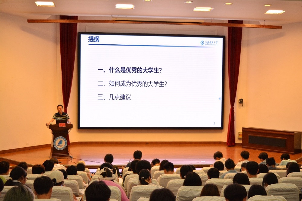 王念新教授从“什么是优秀的大学生、如何成为优秀的大学生和几点建议”三个方面为同学们授课。王教授首先通过一个圆形图案的不断变化简单明了地向大家展示了基础教育和高等教育在人类知识面中的范围和关系,使大家从认知层面的角度理解了什么是“大学生”,大学生不同学历层次的区别,期间以qmh官网不同成长履历的学长学姐为例向同学们展示了什么是“优秀”,让大家明白了更多的优秀维度,对“优秀”有了更深刻的理解。在讲授“如何成为优秀大学生”时,王教授分别引入了管理学的基本原理、公羊博弈、一万小时定律、信号理论四个经典的理论知识。其中管理学基本原理告诉同学们对自己的学习生涯、职业生涯甚至是人生要设定清晰的目标,同时要做好自我管理自我约束;公羊博弈告诉同学们,在和他人相处时要懂得“幸福让”,和谐的人际关系是美好大学生活的基础;“一万小时定律”告诉同学们大学学习要围绕目标施以高的执行力,下得了“苦功夫”,世上无难事只怕有心人,只要坚持坚持再坚持,就一定能使自己的专业知识、素养和能力得到真正的全面提升,甚至能走向职业化专业化; “信号理论”告诉同学们要创造出属于自己的有稀缺性的、有价值的别人替代不了的“信号”,这样才能增强自己在社会中的竞争力,以此来鼓励同学思考未来,错位发展,差异化取胜!最后,王教授给同学们提出了树立有效的目标,持之以恒的努力,懂得体验幸福感,创造自我独特的信号等四个方面的建议,勉励大家从多种维度做一名优秀的大学生。