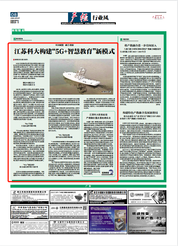 2021年,由江苏科大牵头,联合运营商、海洋装备研究院、软件企业等研究机构和企业申报的“基于5G专网的智慧教育环境建设”获批工业和信息化部、教育部“5G+智慧教育”应用试点,江苏科大成为全国69个试点高校之一。该项目也为江苏科大推进“5G+智慧教育”新模式奠定了良好基础。