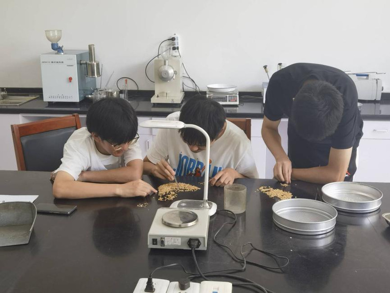 科技加持下的收储工作也离不开过硬的业务水平。在洪泽湖收储库,实践团成员在化验员的指导下体验了利用扦样器取样,分辨并分捡出样品中存在的不完善粒和杂质并进行计算。这项工作充分考验化验员能否在高强度的验收工作中以同样的责任心,同样的验收标准对每一批入库粮食进行检验。仓管科科长夏海滨向实践团成员们强调“认真定等,把好粮食质量关,维护企业和售粮户利益,保证国家储备粮质量,是一名国储库化验员的神圣职责。”