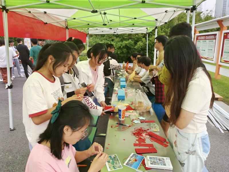 “折纸风车,书写爱国之情”活动的现场,参加活动的同学们在卡片上写下对祖国的热爱与美好祝福,并挂在自己精心制作的风车上,微风吹拂,风车转动,同学们对祖国飞速发展的感慨、对祖国踏上新征程的祝福也随风去向远方。