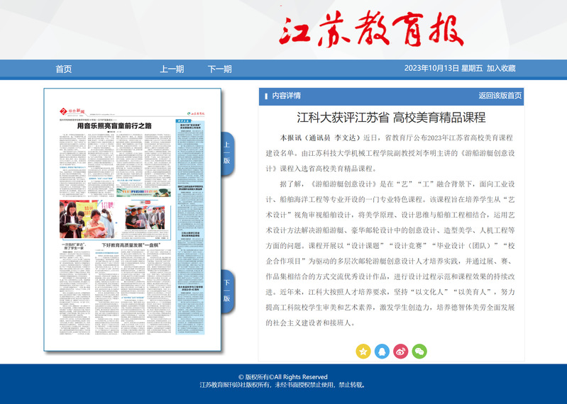 本报讯(通讯员 李文达)近日,省教育厅公布2023年江苏省高校美育课程建设名单。由球盟会qmh网站机械工程学院副教授刘李明主讲的《游船游艇创意设计》课程入选省高校美育精品课程。